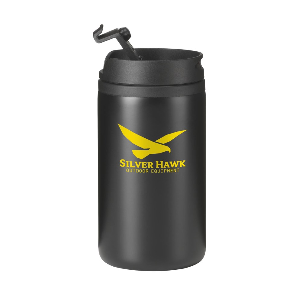 Dubbelwandige thermosbeker met RVS buitenwand en kunststof binnenwand, schroefdeksel met klikopening en slipvaste onderzijde. Lekvrij. Inhoud 300 ml. Per stuk in doos.