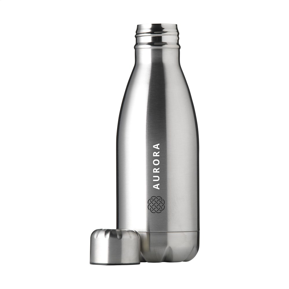 Enkelwandige, RVS waterfles met lekvrije schroefdop. Inhoud 500 ml. Per stuk in doos.