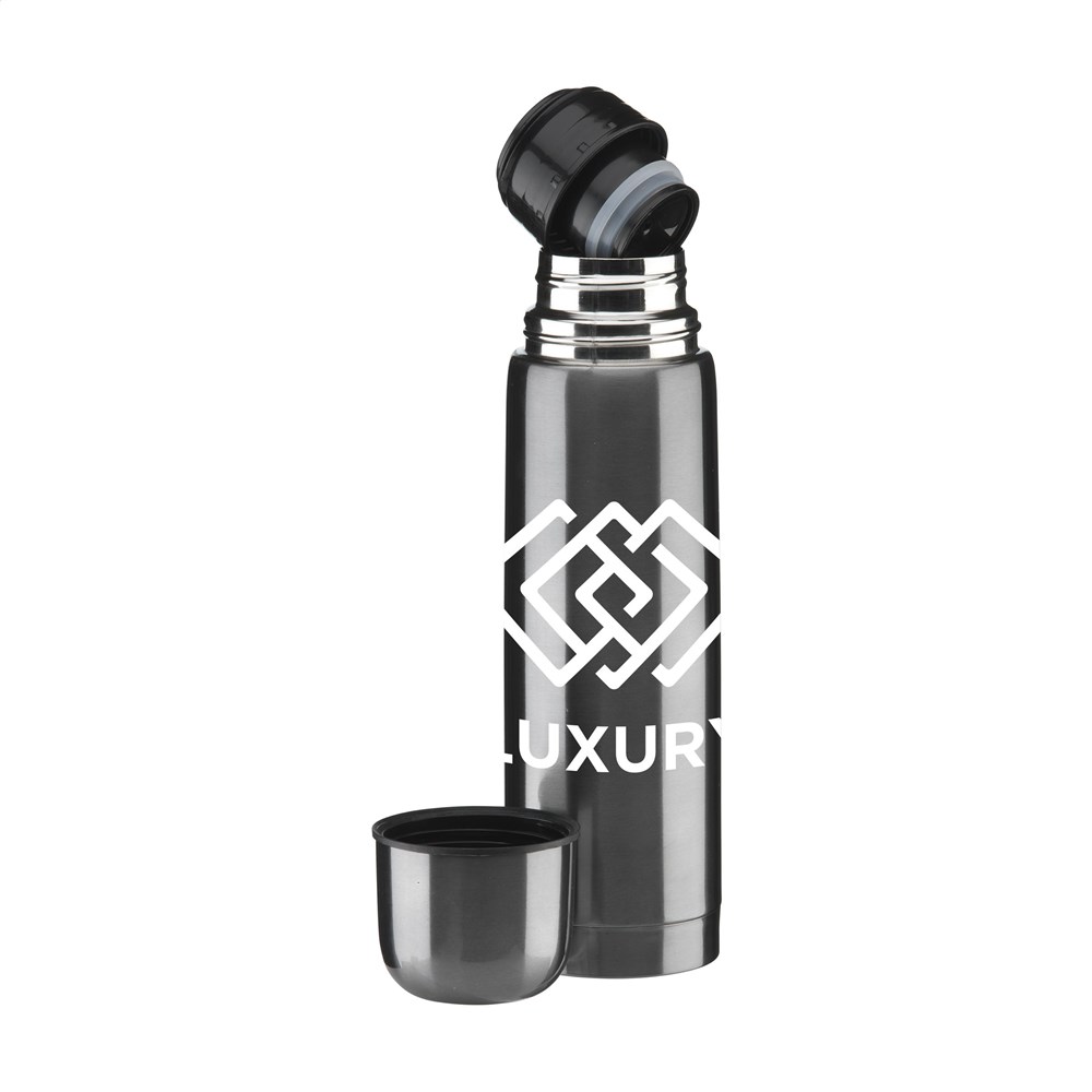 Vacuüm geïsoleerde, RVS thermosfles met schroefdop/drinkbeker en handig schenksysteem met druksluiting. Inhoud 500 ml. Per stuk in doos.