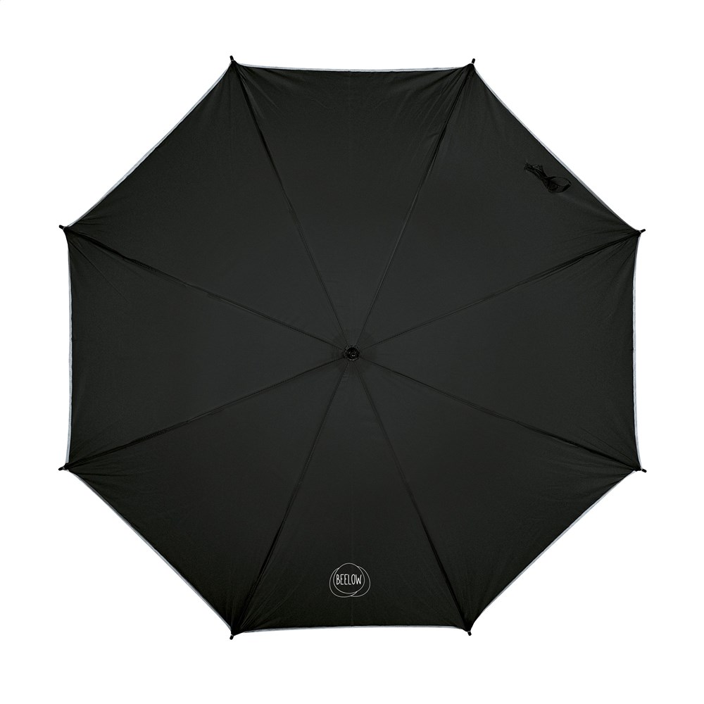 Lichtgewicht stormparaplu met reflecterende bies, 190T nylon bespanning, glasvezel frame, metalen steel, soft handgreep en klittenbandsluiting.