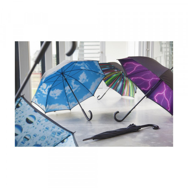Paraplu met bedrukte binnenzijde, 2-laags 190T nylon bespanning, metalen frame, houten steel, handgreep en klittenbandsluiting.