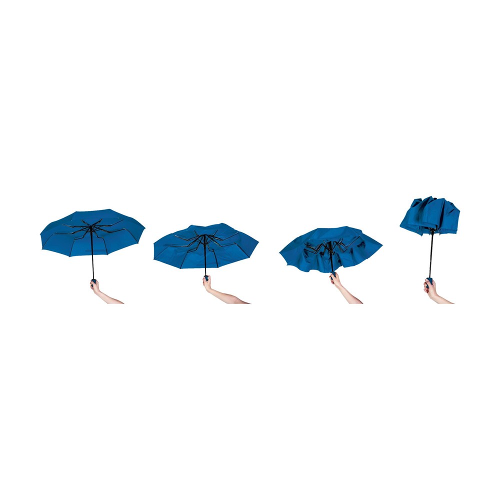Volautomatische in- en uitklapbare paraplu met 190T pongee nylon bespanning, metalen frame en steel, kunststof handgreep met drukknop en polslus, klittenbandsluiting en opberghoes. Lengte ingevouwen: 28,5 cm.