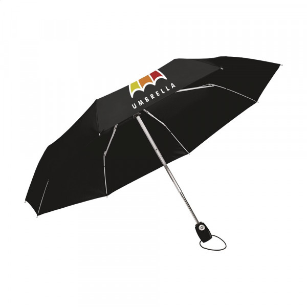 Volautomatische in- en uitklapbare paraplu met 190T pongee nylon bespanning, metalen frame en steel, kunststof handgreep met drukknop en polslus, klittenbandsluiting en opberghoes. Lengte ingevouwen: 28,5 cm.