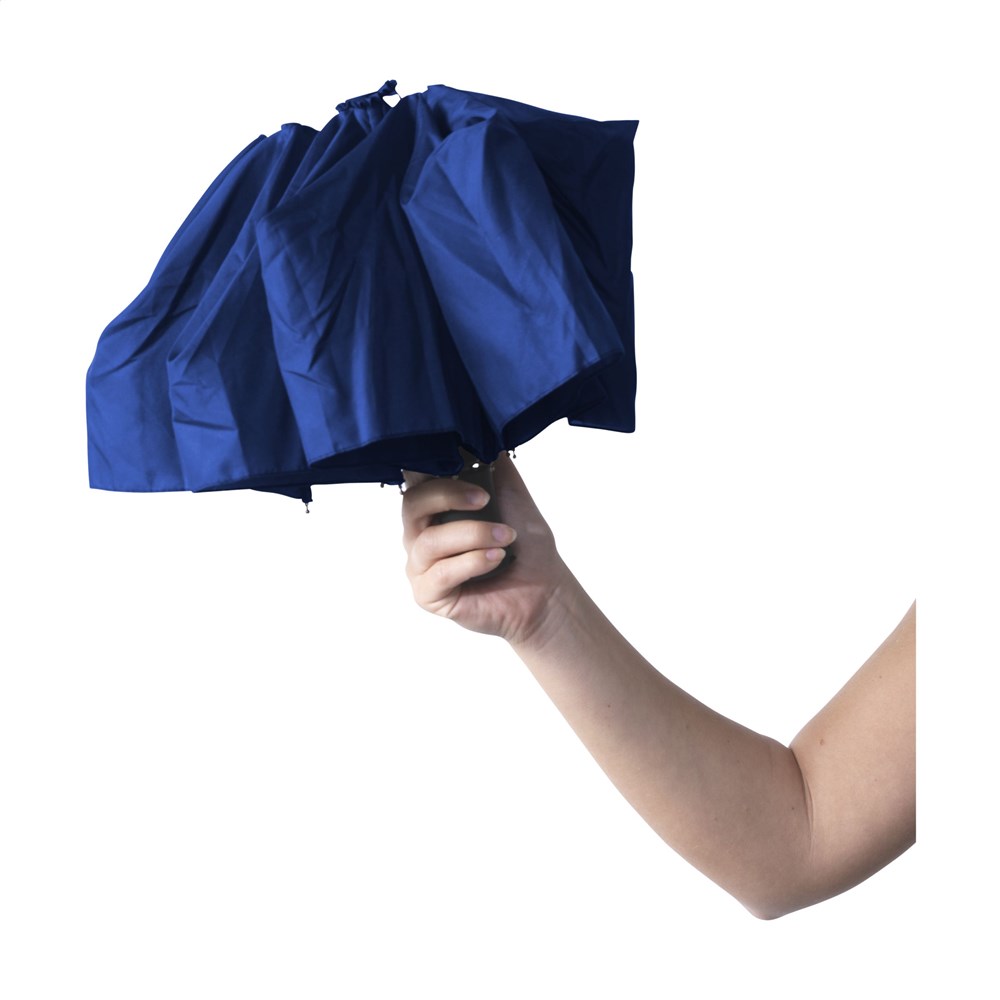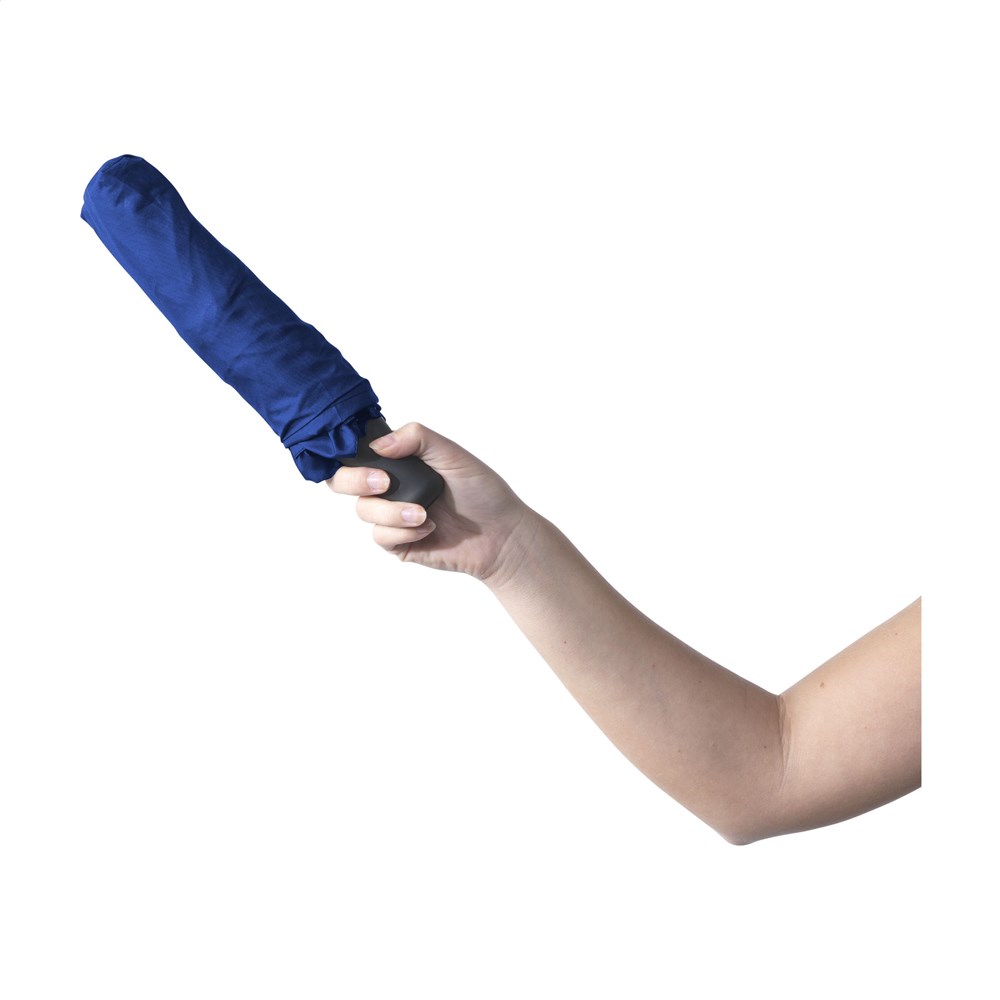Volautomatische in- en uitklapbare paraplu met 190T pongee nylon bespanning, metalen steel en frame, rubberen handgreep met polslus, klittenbandsluiting en opberghoes. Lengte ingevouwen: 28 cm.