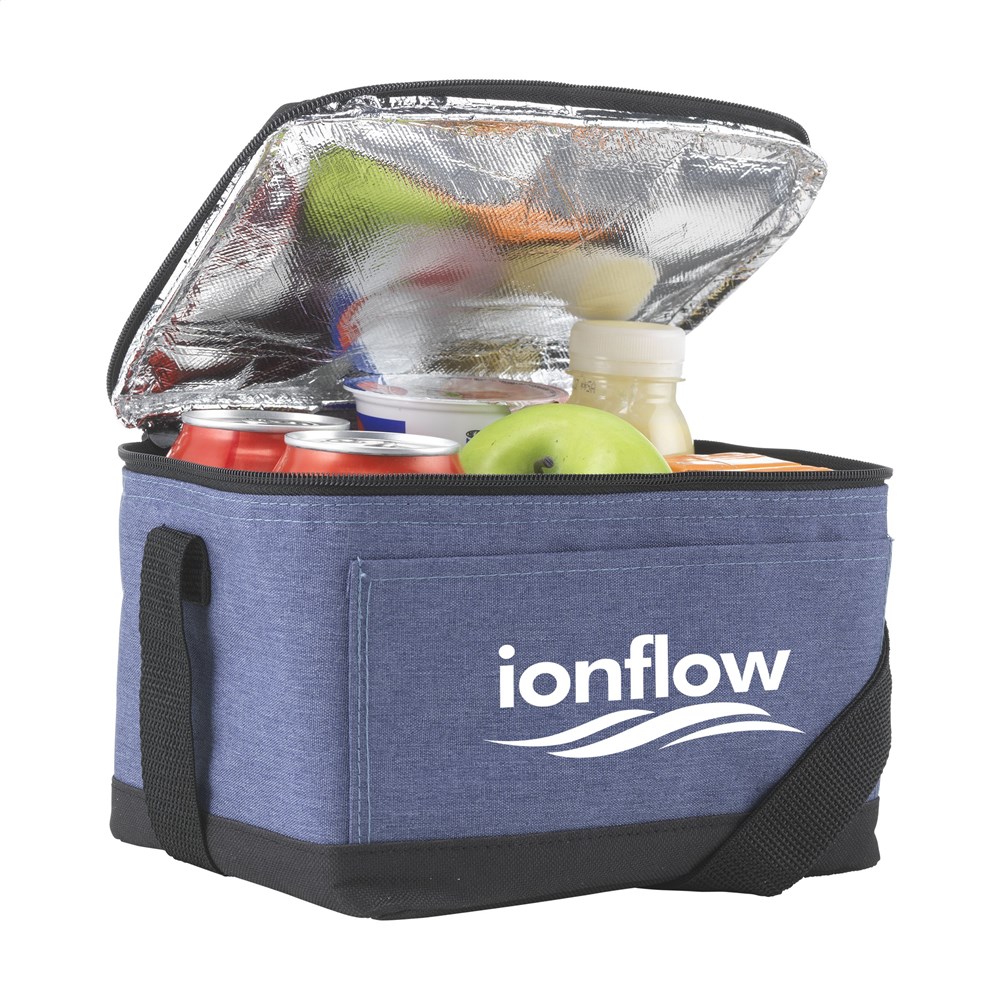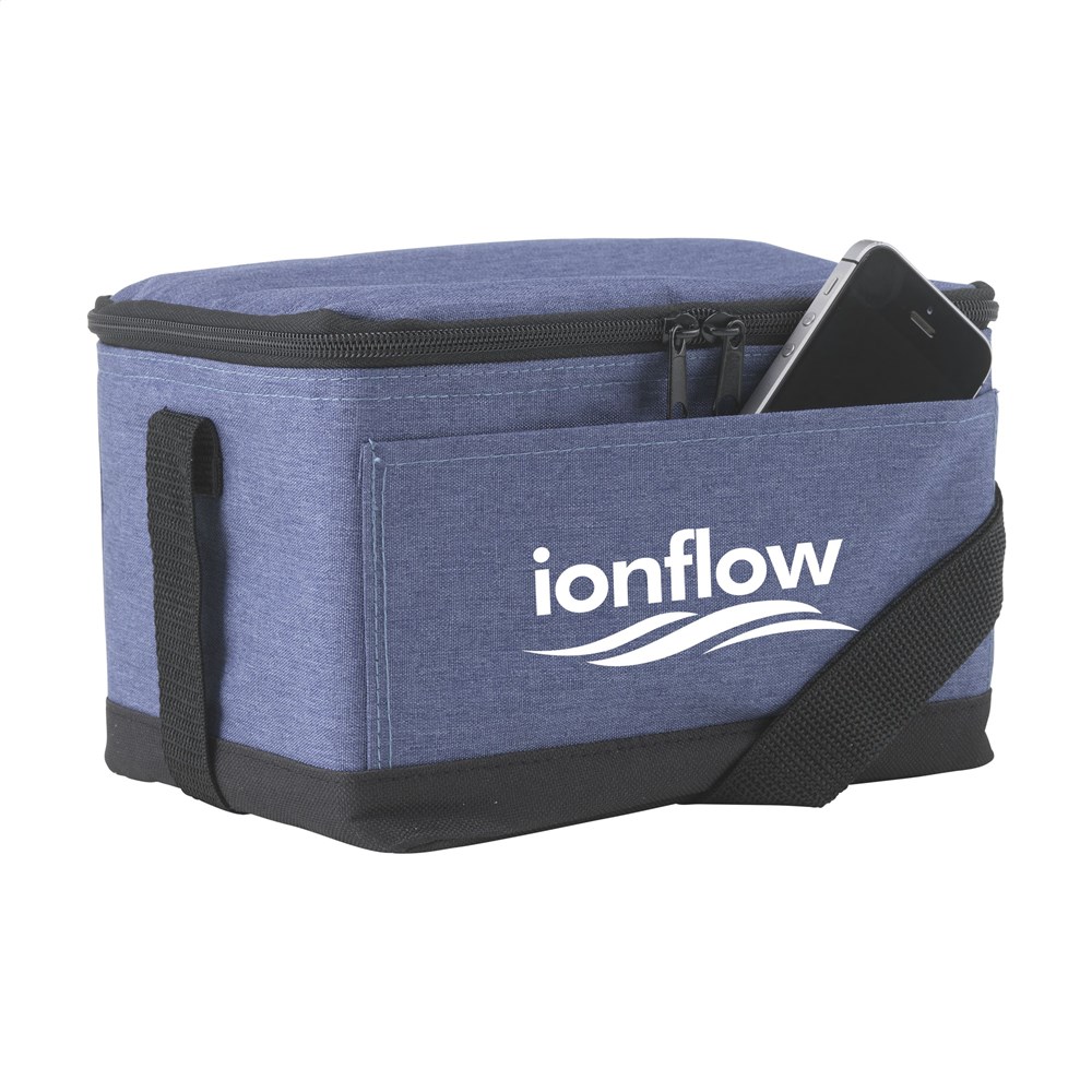 Polyester koeltasje in jeans look. Met voorvakje en verstelbare draagriem. Geschikt voor 6 blikjes drank.