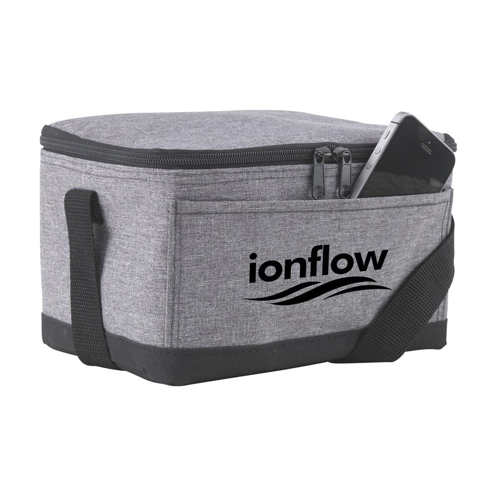 Polyester koeltasje in jeans look. Met voorvakje en verstelbare draagriem. Geschikt voor 6 blikjes drank.