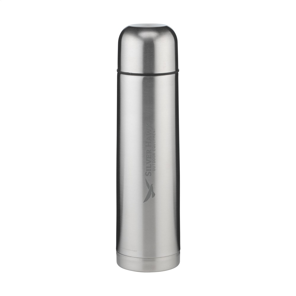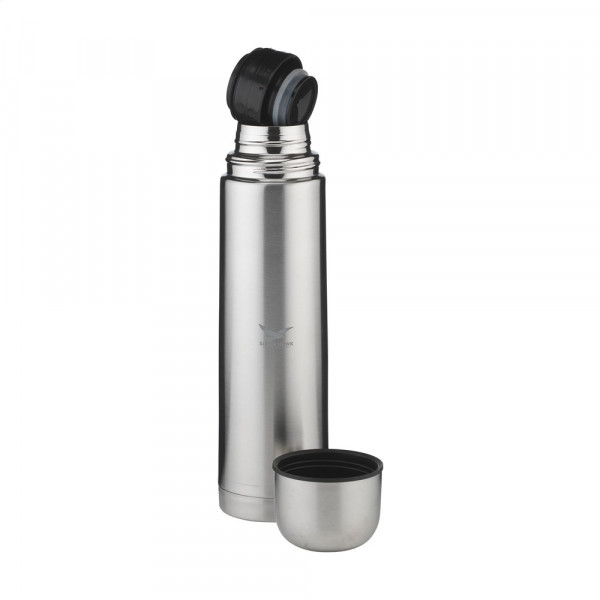 Dubbelwandige, vacuüm geïsoleerde, RVS thermosfles met schroefdop/drinkbeker en handig schenksysteem met druksluiting. Inhoud 1.000 ml. Per stuk in doos.
