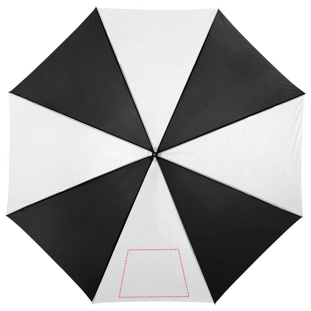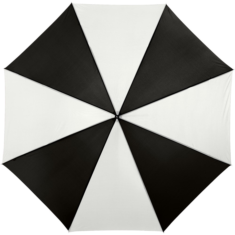23" automatische paraplu met metalen schacht en baleinen en houten handvat.