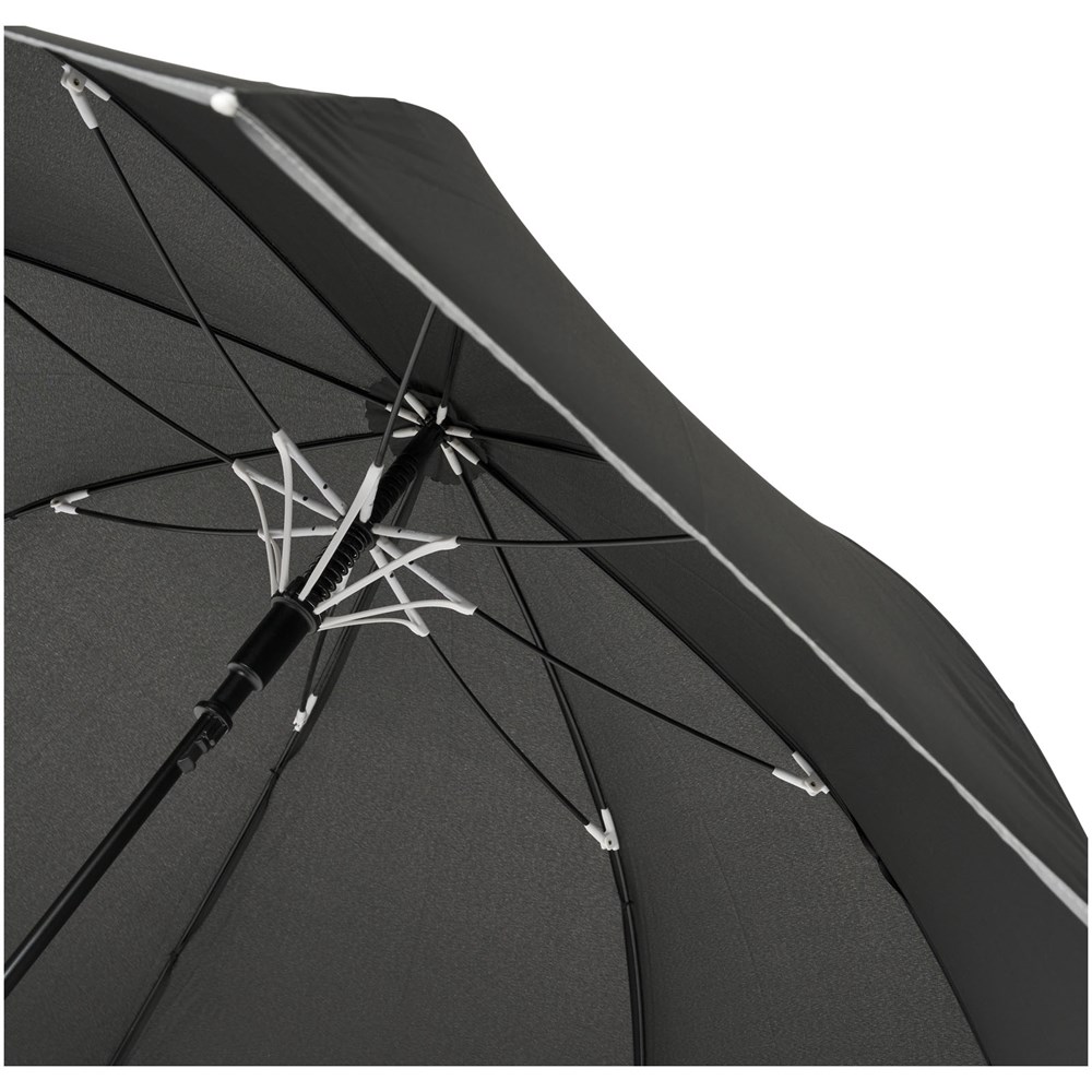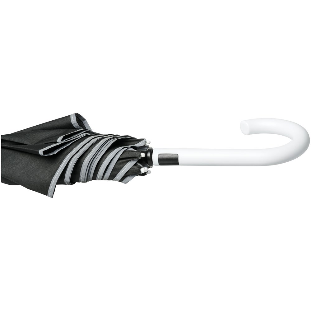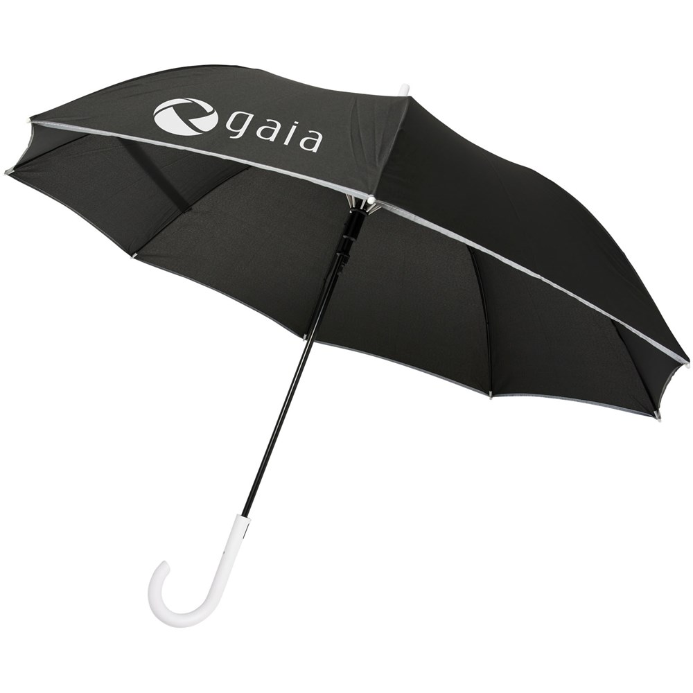 Automatisch openende paraplu met een pongé polyester scherm met reflecterende ribben. De stevige metalen schacht en het hoogwaardige frame volledig uit glasvezel bieden maximale flexibiliteit bij winderige omstandigheden. De kromme handgreep heeft een geïntegreerde drukknop. Het pongé polyester scherm is gemaakt van een reflecterende stof voor betere zichtbaarheid tijdens donkere momenten op een regenachtige dag. Gekleurde details zijn beschikbaar voor het glasvezel frame en worden door de handgreep, de punten en de spits geleid. Groot decoratievlak beschikbaar op elk van de panelen.