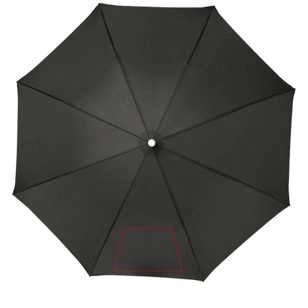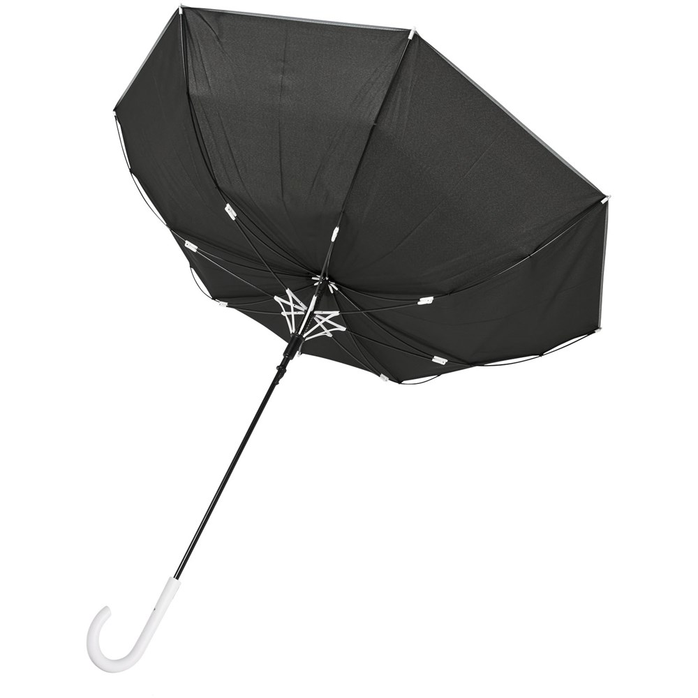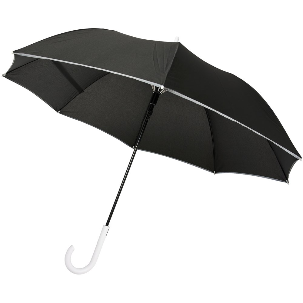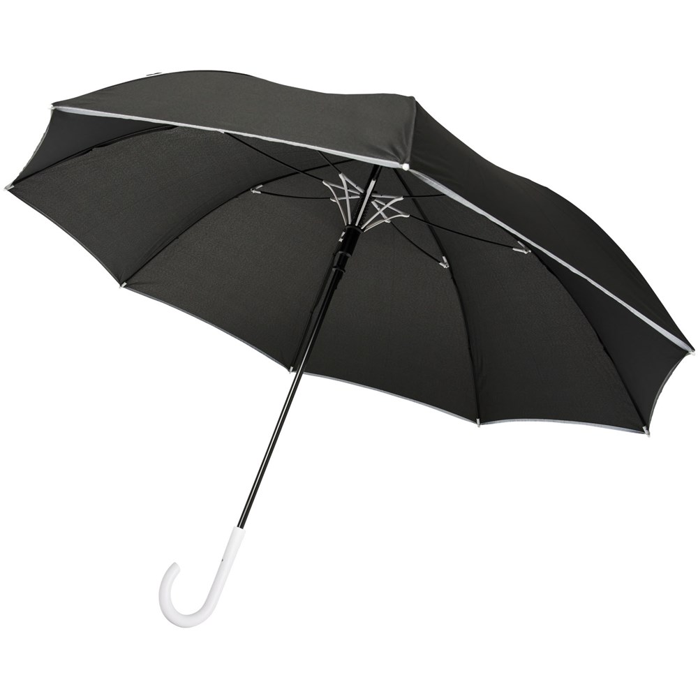 Automatisch openende paraplu met een pongé polyester scherm met reflecterende ribben. De stevige metalen schacht en het hoogwaardige frame volledig uit glasvezel bieden maximale flexibiliteit bij winderige omstandigheden. De kromme handgreep heeft een geïntegreerde drukknop. Het pongé polyester scherm is gemaakt van een reflecterende stof voor betere zichtbaarheid tijdens donkere momenten op een regenachtige dag. Gekleurde details zijn beschikbaar voor het glasvezel frame en worden door de handgreep, de punten en de spits geleid. Groot decoratievlak beschikbaar op elk van de panelen.