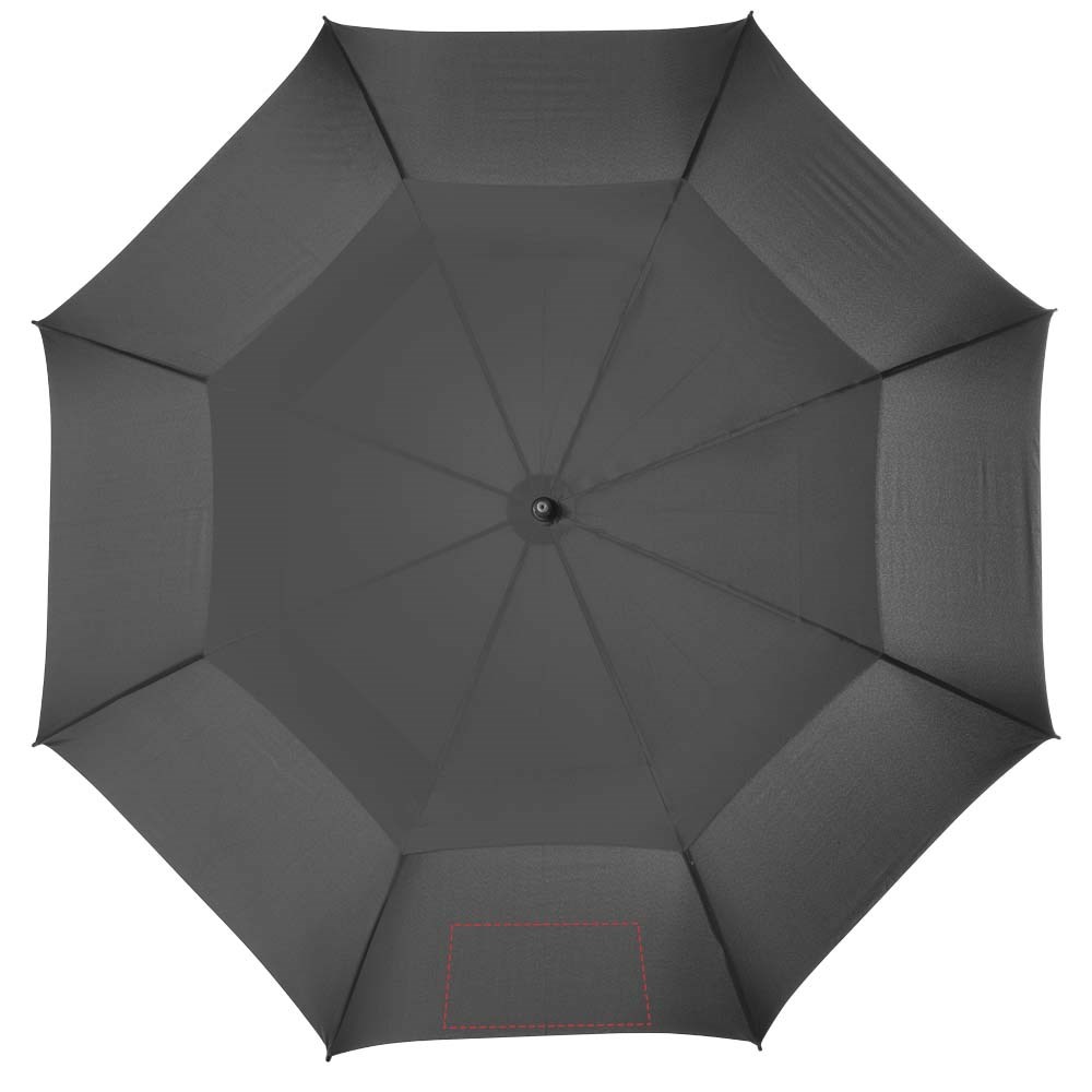 Automatisch openende golfparaplu met geventileerd scherm van pongé polyester, groot genoeg om 2 personen droog te houden. Metalen schacht met glasvezel baleinen en speciaal ventilatiesysteem voor maximale flexibiliteit bij harde wind. Geventileerde opberghoes van pongé polyester in contrastkleur. 'Luxe' branding in doming-techniek op de handgreep met rubberlaag en drukknop in grijs metallic afwerking. Twee stevige sluitriempjes in bijpassende kleuren. Met hoes. Het perfecte cadeau met de perfect luxe uitstraling.
