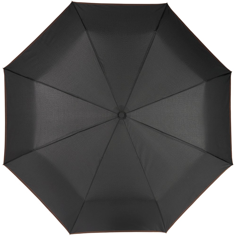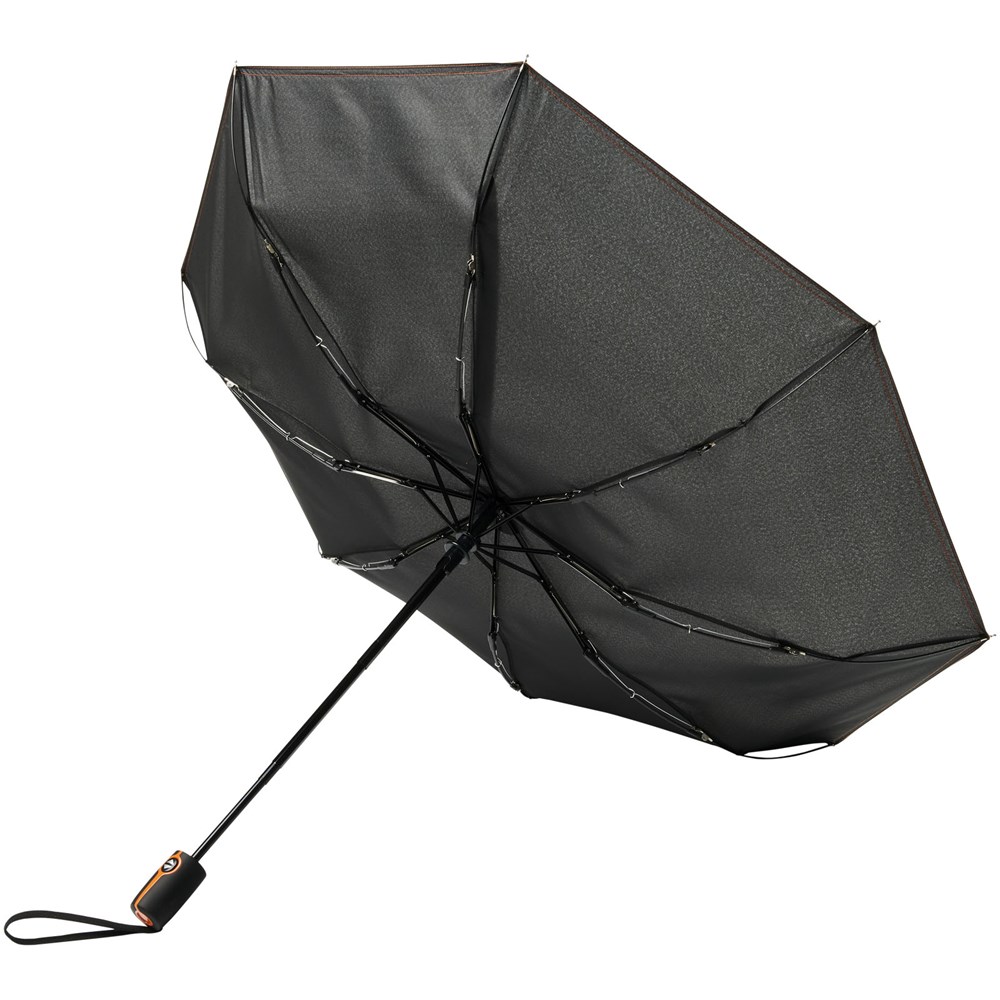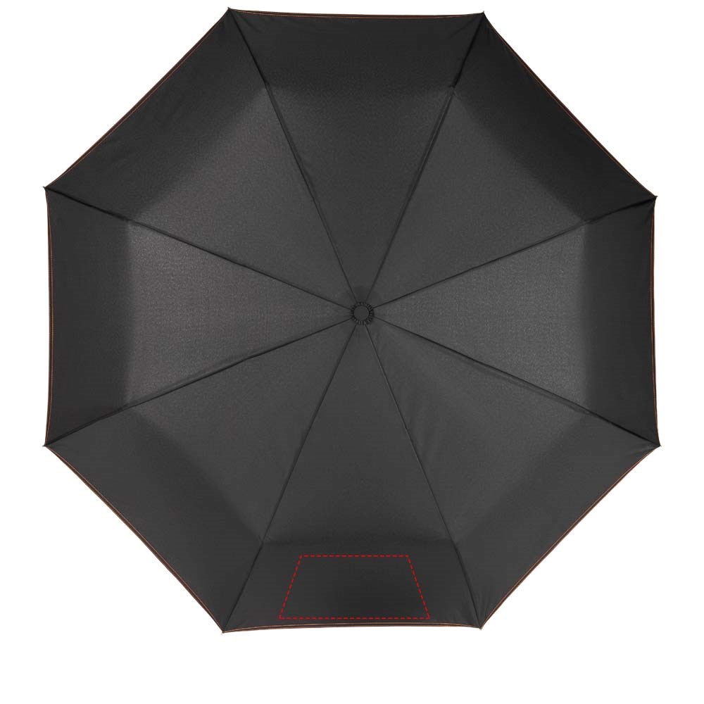 Automatisch openende en sluitende paraplu met een pongé polyester scherm. De stevige metalen schacht en het hoogwaardige frame volledig uit glasvezel bieden maximale flexibiliteit bij winderige omstandigheden. Geleverd met een zakje en is eenvoudig mee te namen doordat hij gemakkelijk in een handtas of rugzak past. Gekleurde details zijn beschikbaar op de zachte handgreep en het gedetailleerde naaiwerk van het scherm en het zakje. Groot decoratievlak op elk van de panelen en de handgreep.