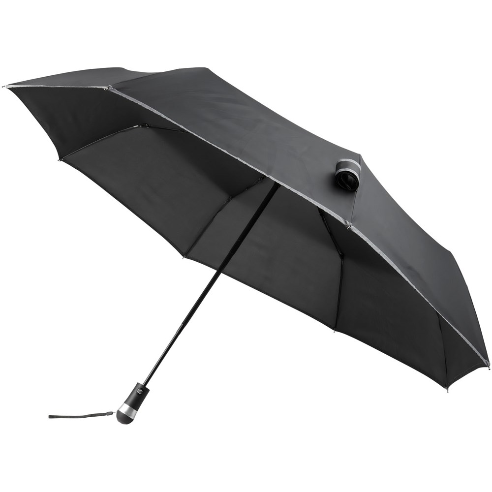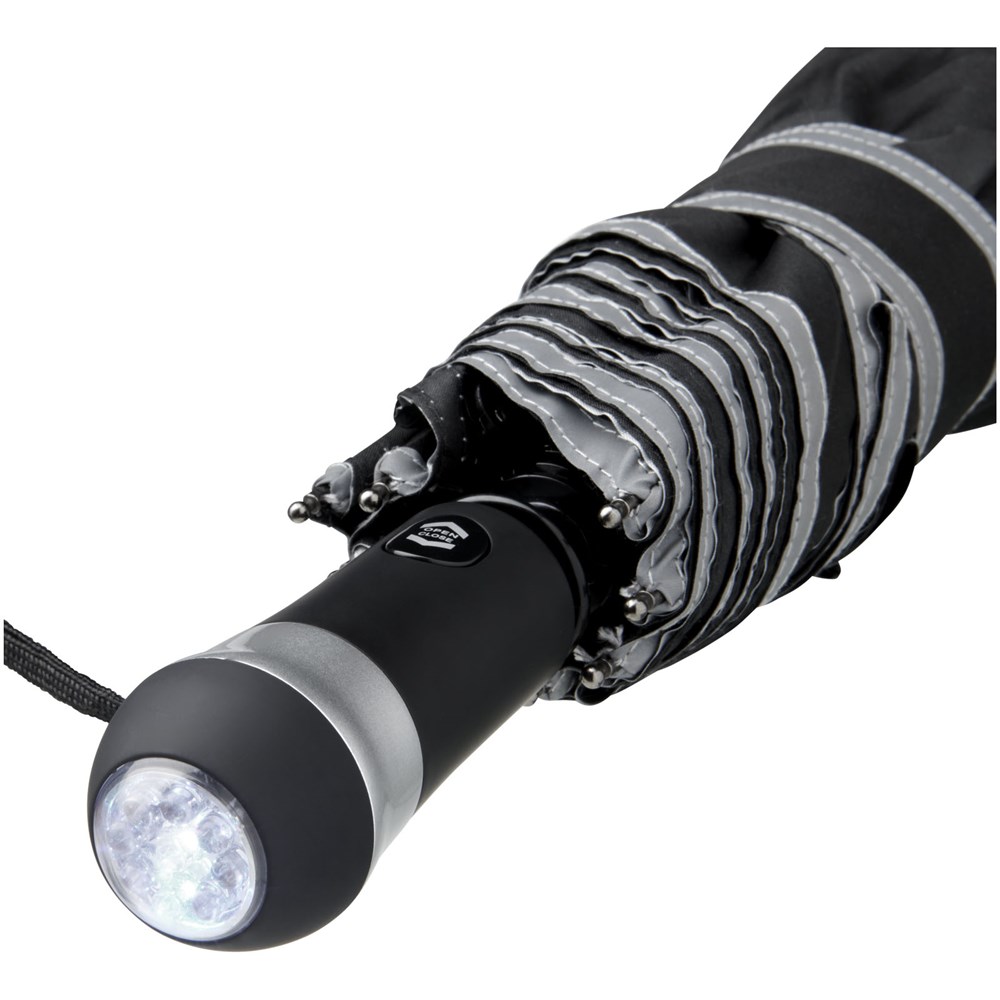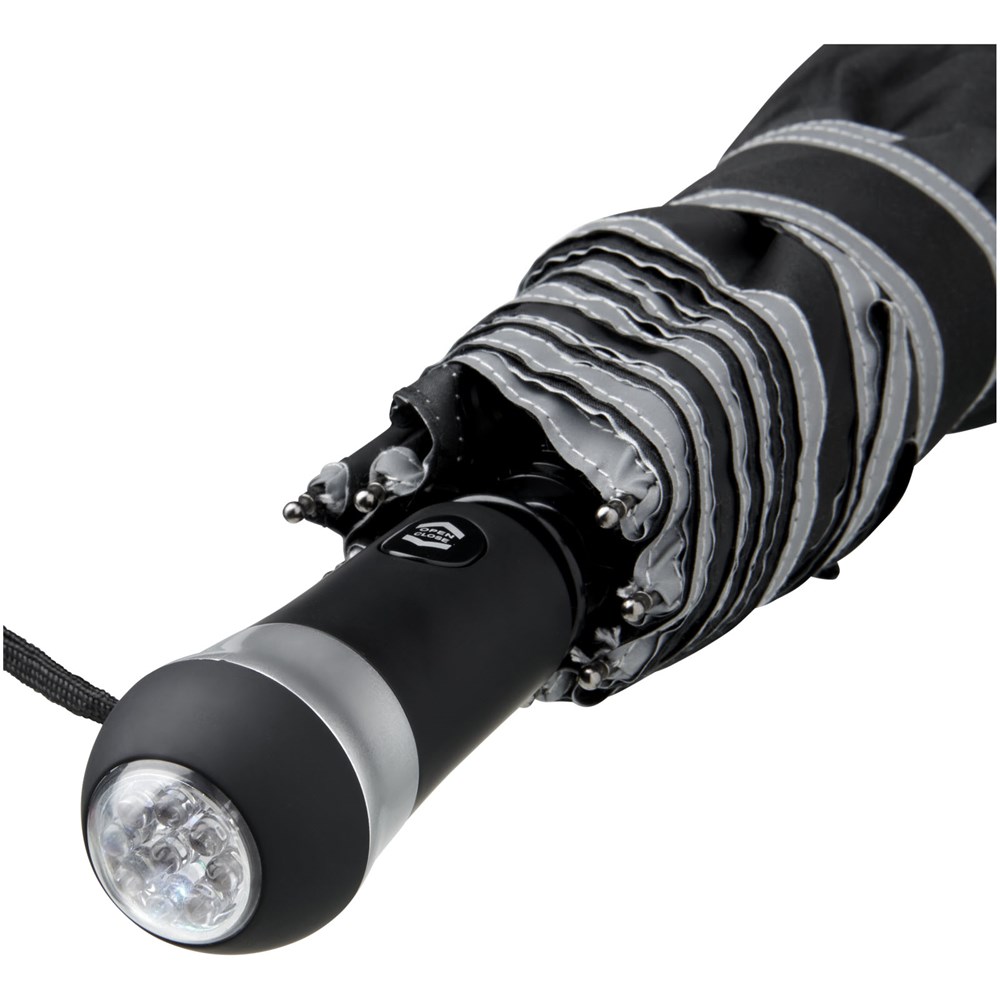 27'' Paraplu die automatisch opent en sluit met geïntegreerd LED-licht en comfortabele rubberen handgreep. Stevige zwarte metalen zeshoekige schacht met baleinen van glasvezel. Inclusief opbergetui in bijpassende kleur. De polyester pongee kap is gemaakt van een reflecterende stof voor betere zichtbaarheid tijdens donkere momenten op een regenachtige dag. 3 batterijen inbegrepen.