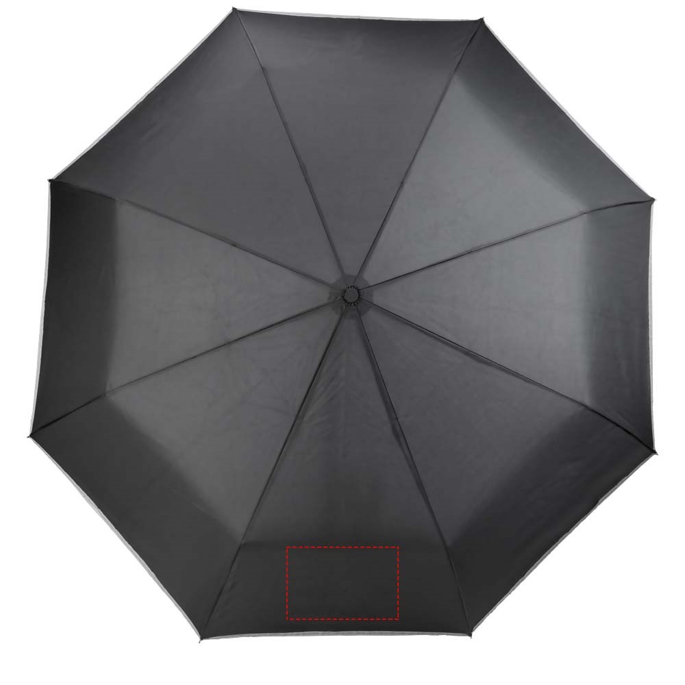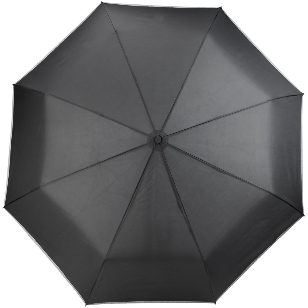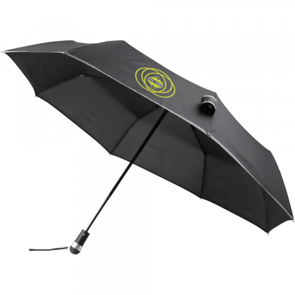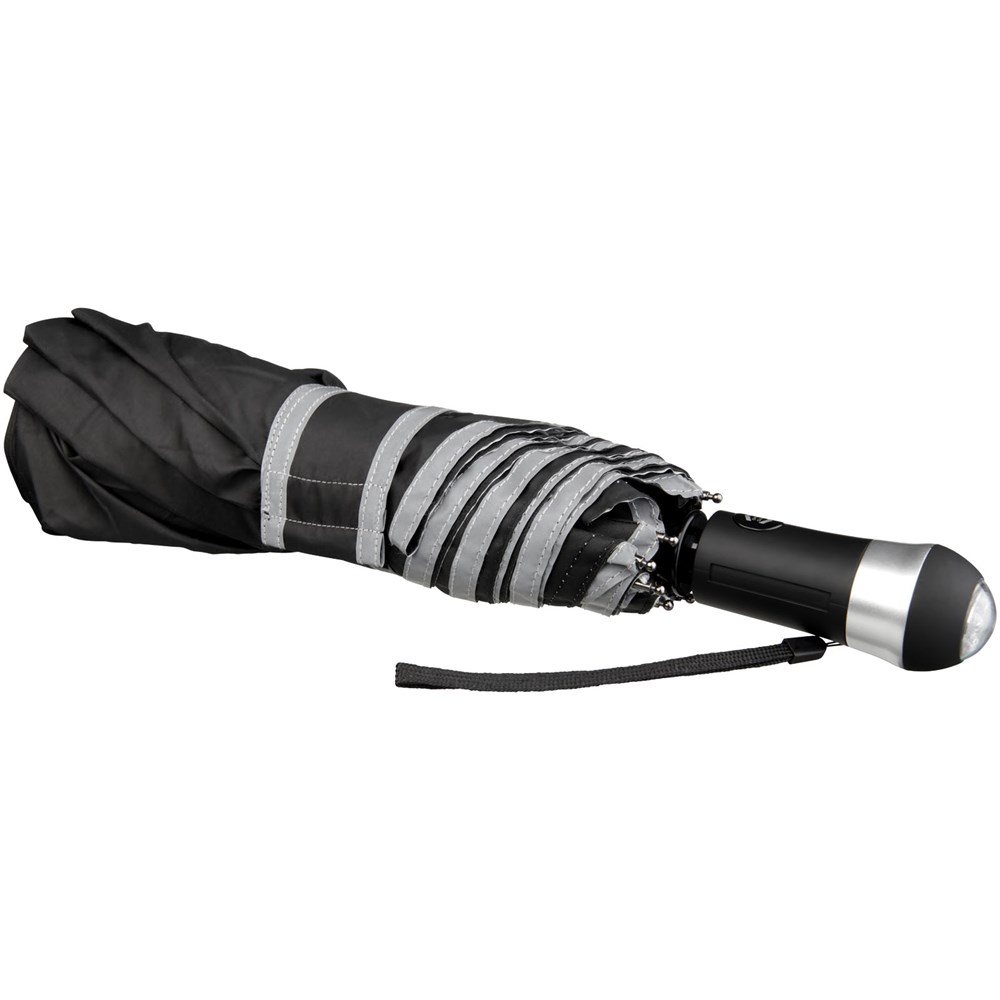 27'' Paraplu die automatisch opent en sluit met geïntegreerd LED-licht en comfortabele rubberen handgreep. Stevige zwarte metalen zeshoekige schacht met baleinen van glasvezel. Inclusief opbergetui in bijpassende kleur. De polyester pongee kap is gemaakt van een reflecterende stof voor betere zichtbaarheid tijdens donkere momenten op een regenachtige dag. 3 batterijen inbegrepen.