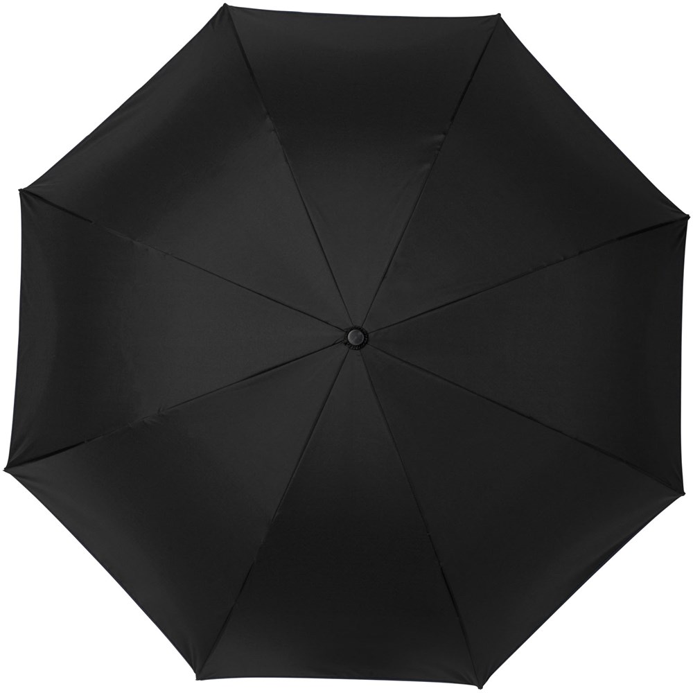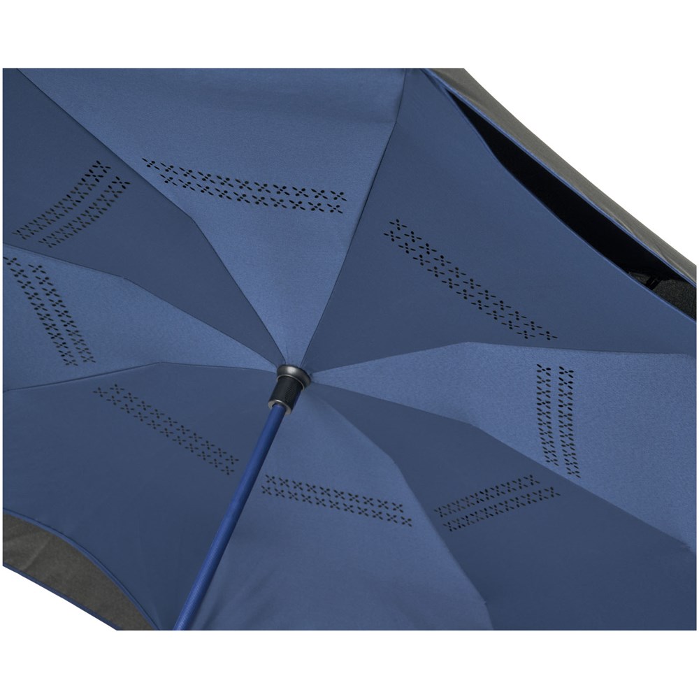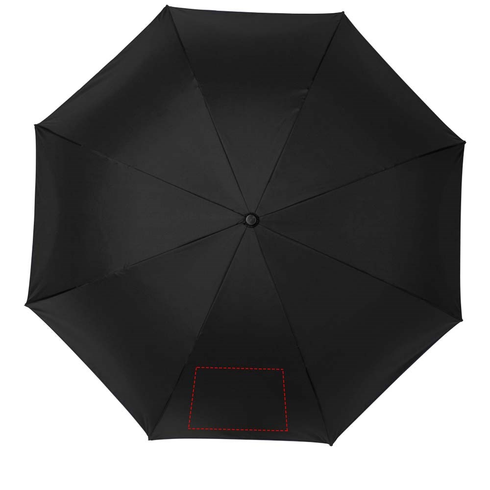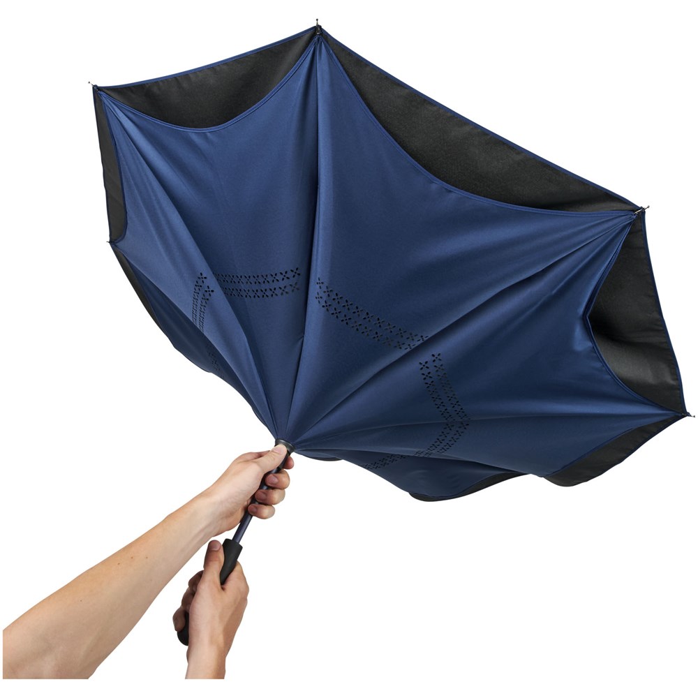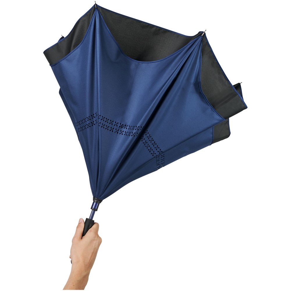 23" innovatief ontwerp doordat hij naar buiten uitvouwt, voorzien van frisse kleuren. Opent en sluit 'binnenstebuiten', waardoor hij eenvoudiger te gebruiken is bij het in en uit een auto stappen doordat het water wordt vastgehouden en de buitenste oppervlakken droog blijven. De paraplu kan zelfstandig staan wanneer hij gesloten is, waardoor het water wegloopt en de paraplu opdroogt. Winddicht frame met baleinen en schacht van glasvezel. Automatisch openen door middel van een drukknop in de stang, en een dubbellaagse pongé polyester kap. De kleuren van binnenzijde van de kap en van het raamwerk aan de buitenzijde passen goed bij zowel de glasvezelschacht als de drukknop. Groot decoratievlak beschikbaar op elk van de panelen.