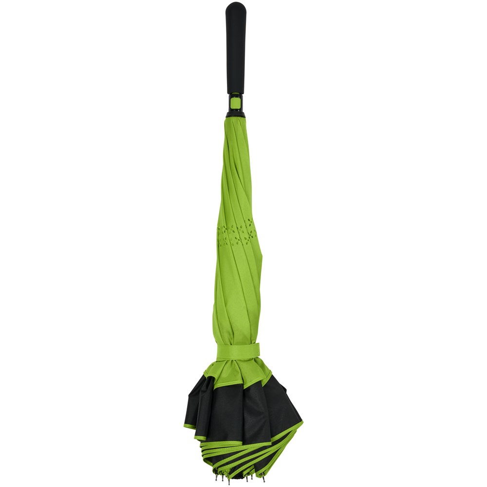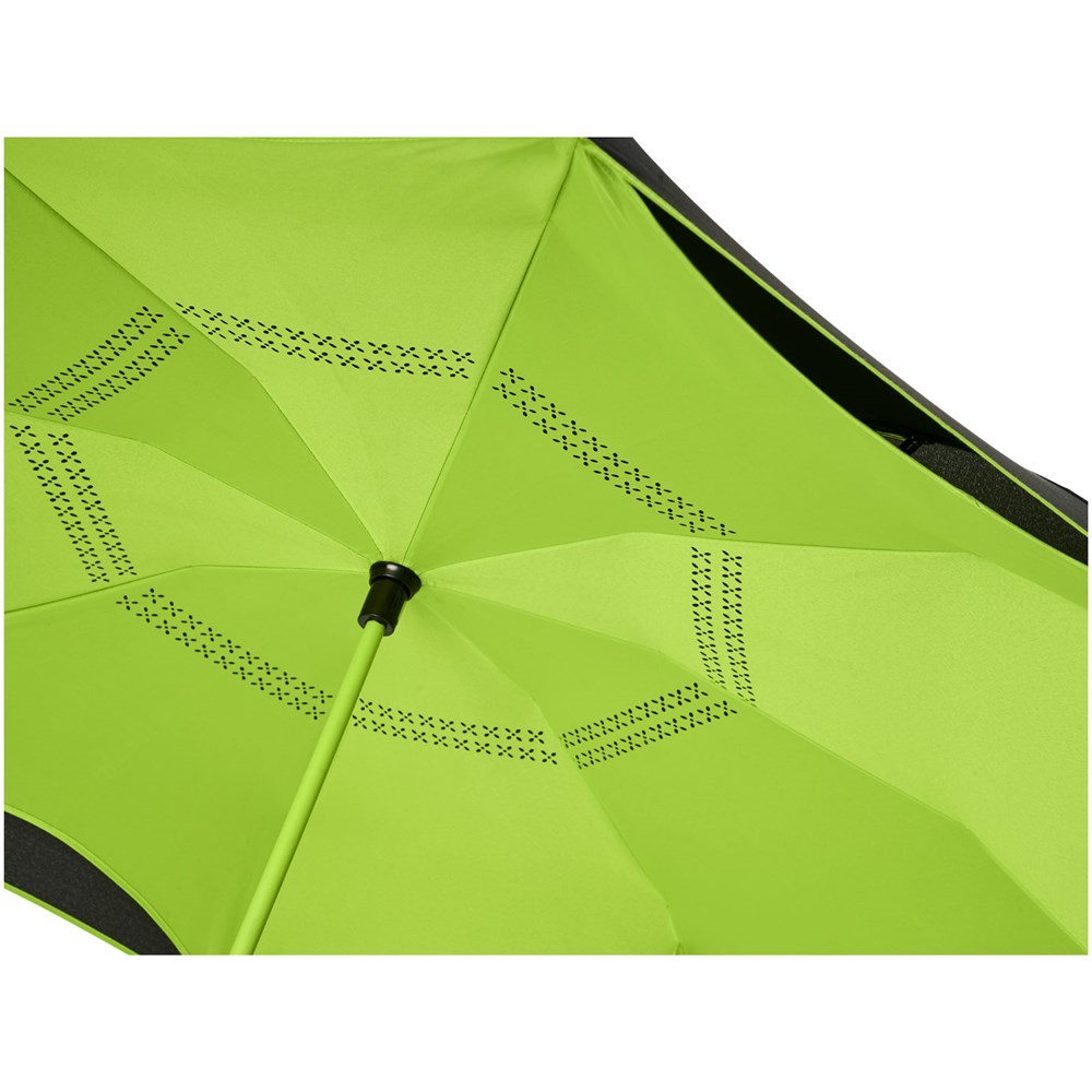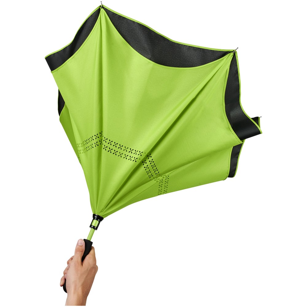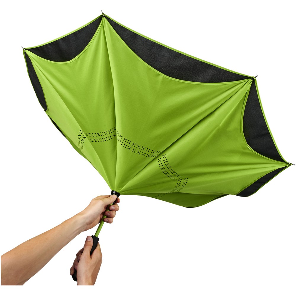 23" innovatief ontwerp doordat hij naar buiten uitvouwt, voorzien van frisse kleuren. Opent en sluit 'binnenstebuiten', waardoor hij eenvoudiger te gebruiken is bij het in en uit een auto stappen doordat het water wordt vastgehouden en de buitenste oppervlakken droog blijven. De paraplu kan zelfstandig staan wanneer hij gesloten is, waardoor het water wegloopt en de paraplu opdroogt. Winddicht frame met baleinen en schacht van glasvezel. Automatisch openen door middel van een drukknop in de stang, en een dubbellaagse pongé polyester kap. De kleuren van binnenzijde van de kap en van het raamwerk aan de buitenzijde passen goed bij zowel de glasvezelschacht als de drukknop. Groot decoratievlak beschikbaar op elk van de panelen.