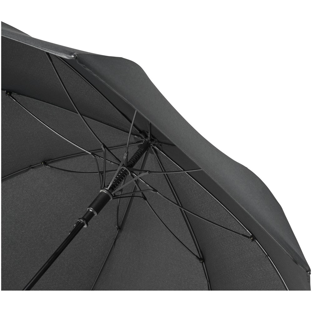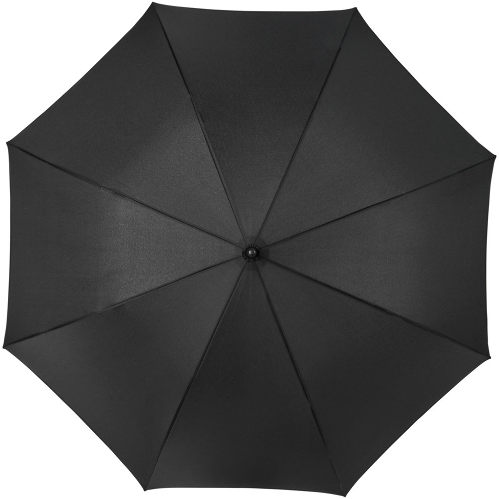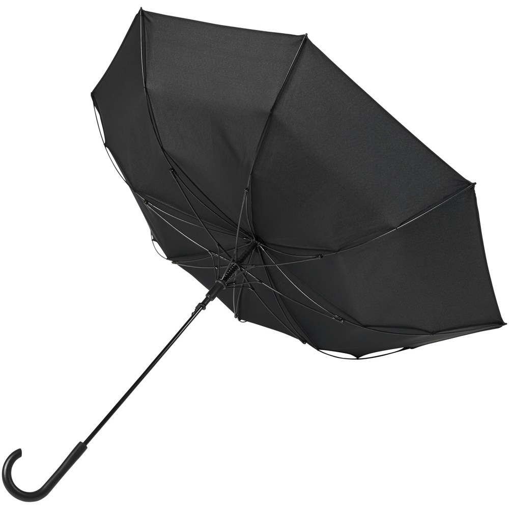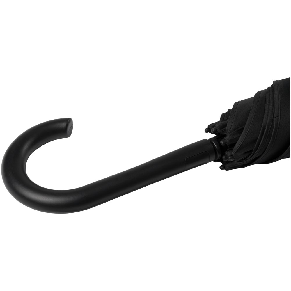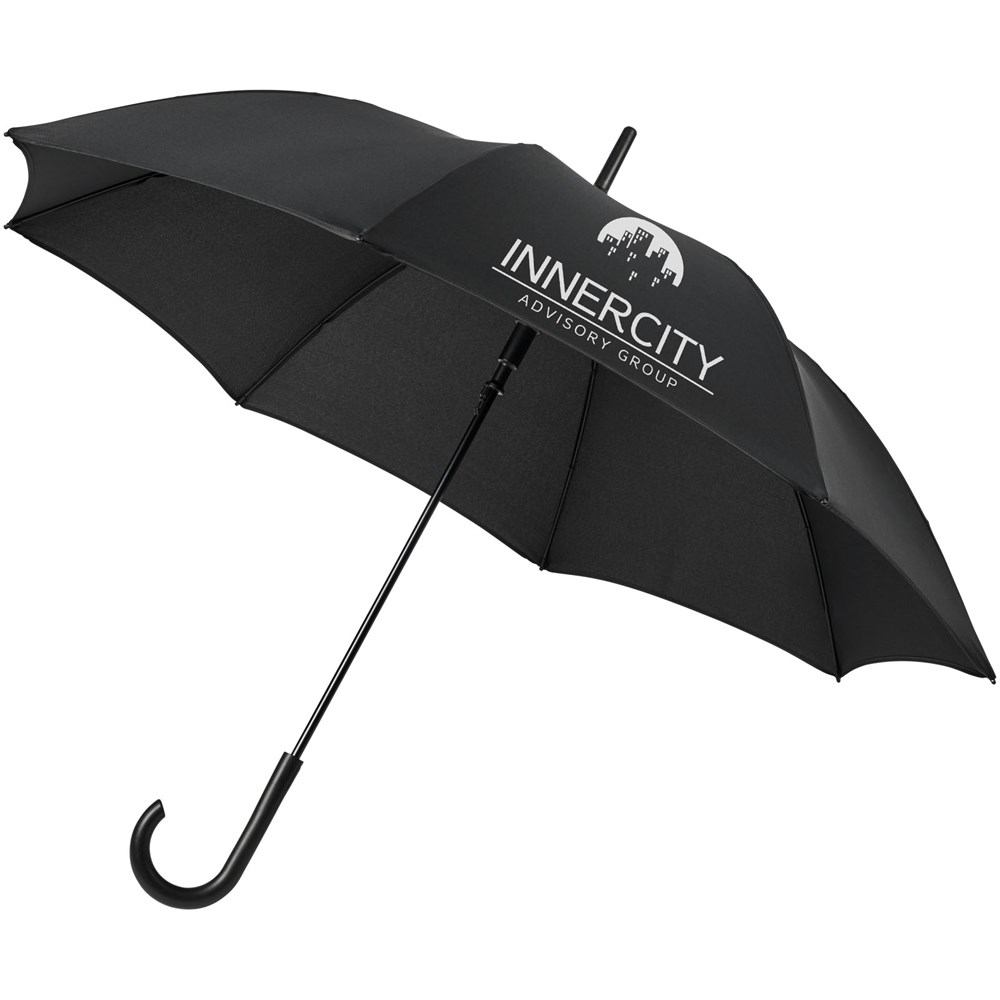 Automatisch openende paraplu met een pongé polyester scherm in frisse kleuren. De stevige metalen schacht en het hoogwaardige frame volledig uit glasvezel bieden maximale flexibiliteit bij winderige omstandigheden. De kromme handgreep heeft een geïntegreerde drukknop. Gekleurde details zijn beschikbaar voor het glasvezel frame en worden door de handgreep, de punten en de spits geleid. Groot decoratievlak beschikbaar op elk van de panelen.