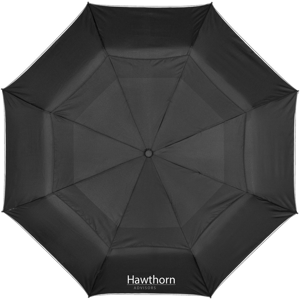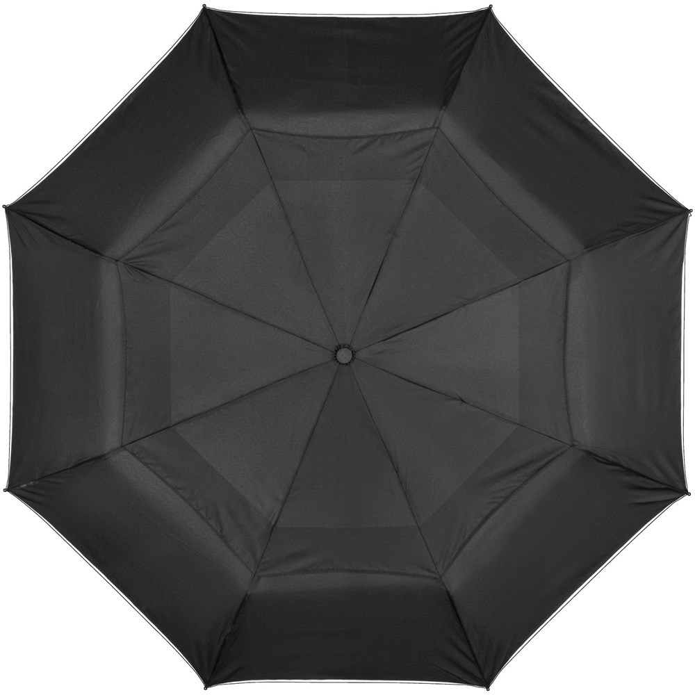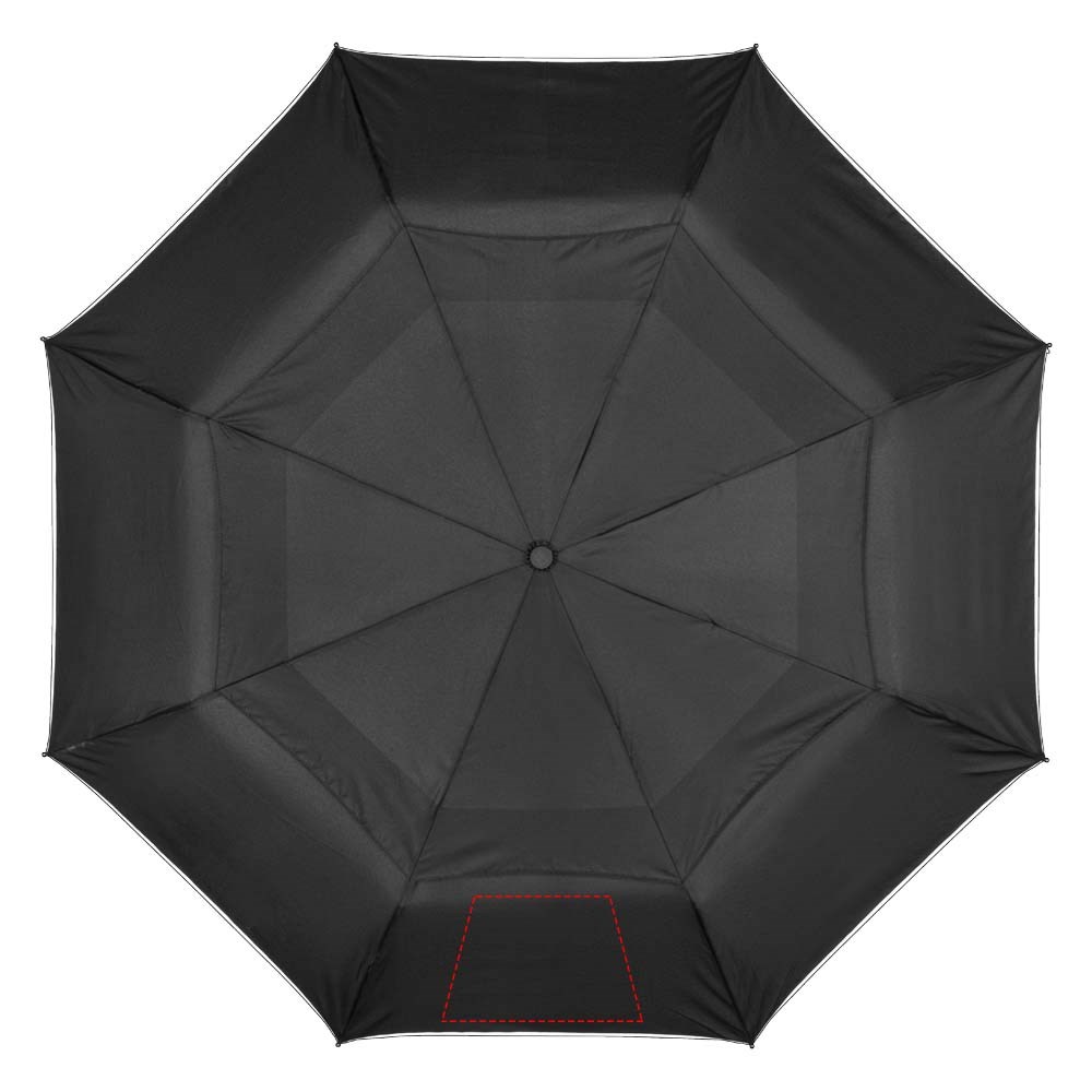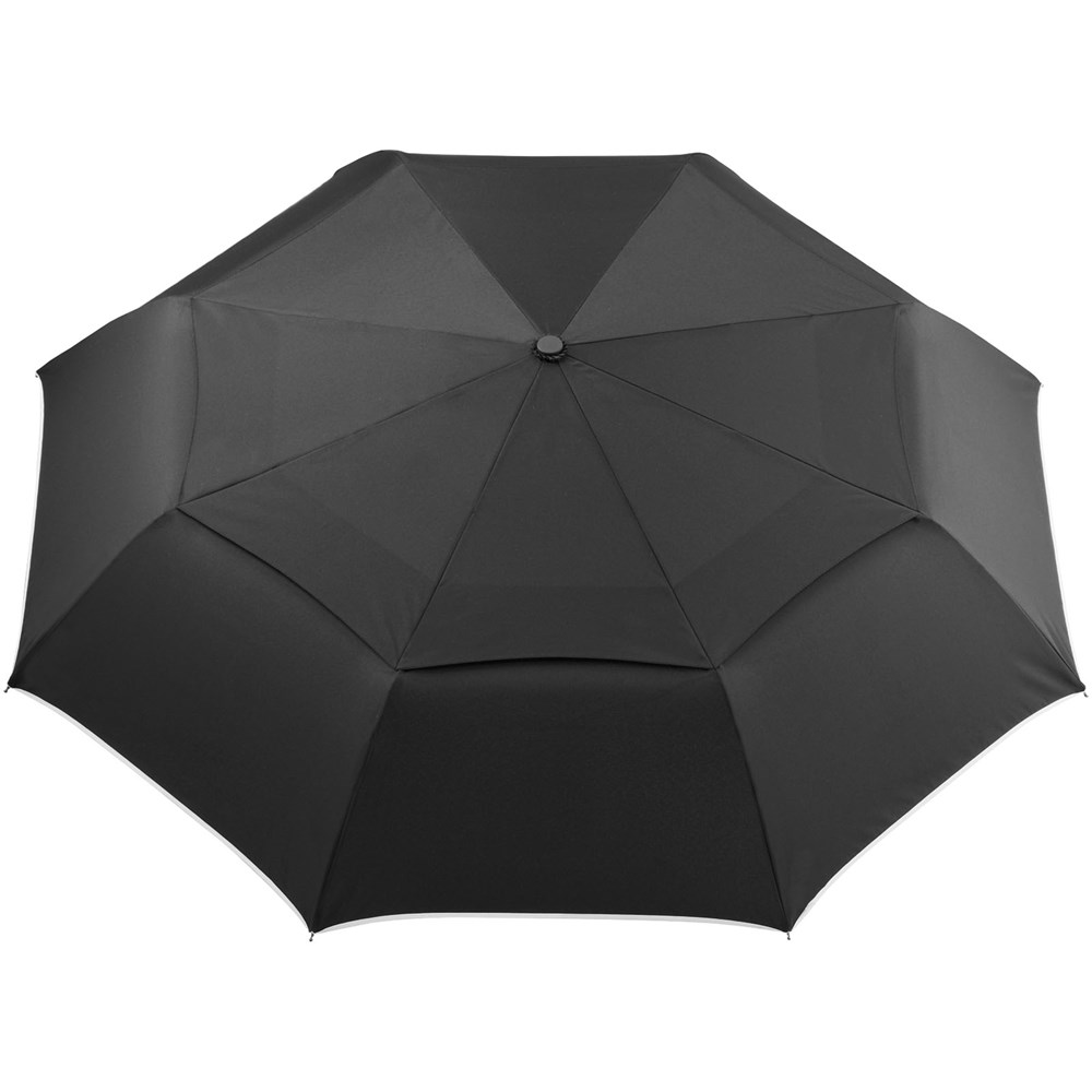 Automatisch openen en sluiten. Geventileerde pongee kap Bijpassende pongee hoes. Driedelige zeshoekige opklapbare stalen schacht. Winddicht frame met baleinen van glasvezel. Met rubber beklede handgreep met polsbandje. Opvouwbaar tot slechts 28 cm lang.