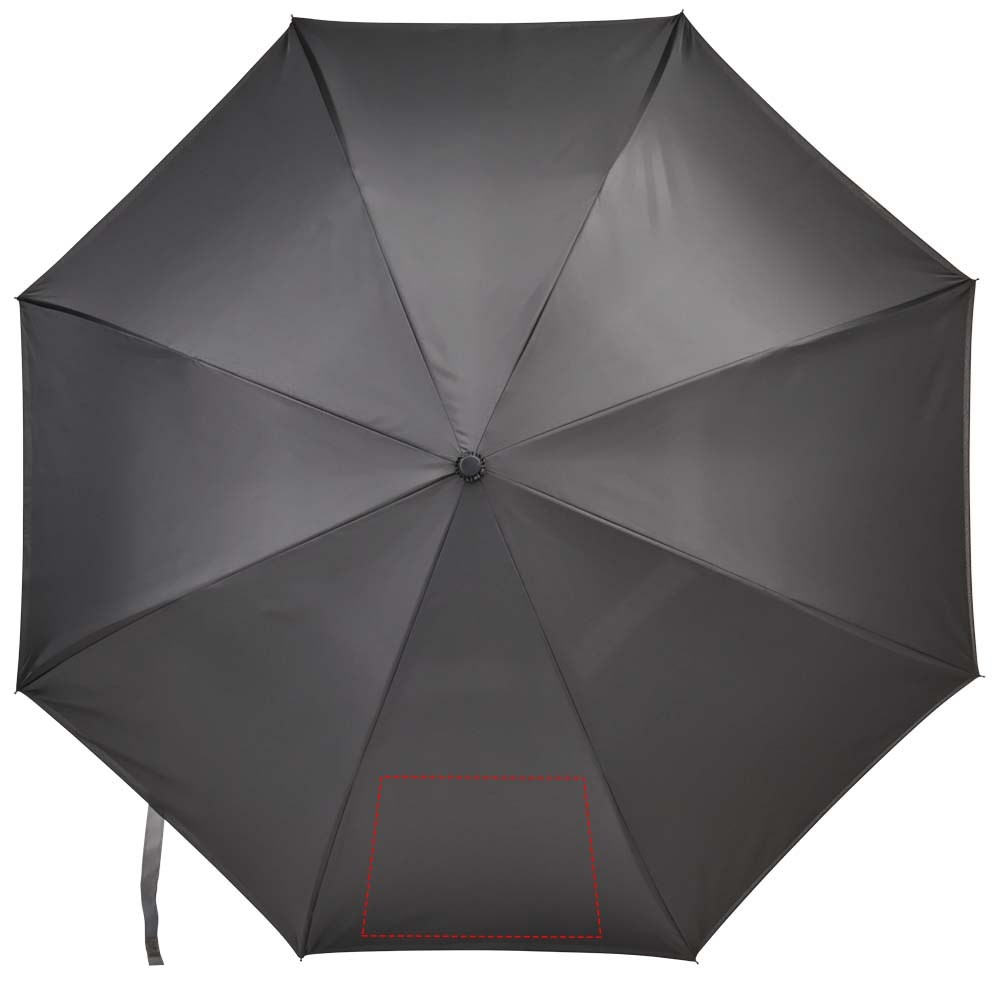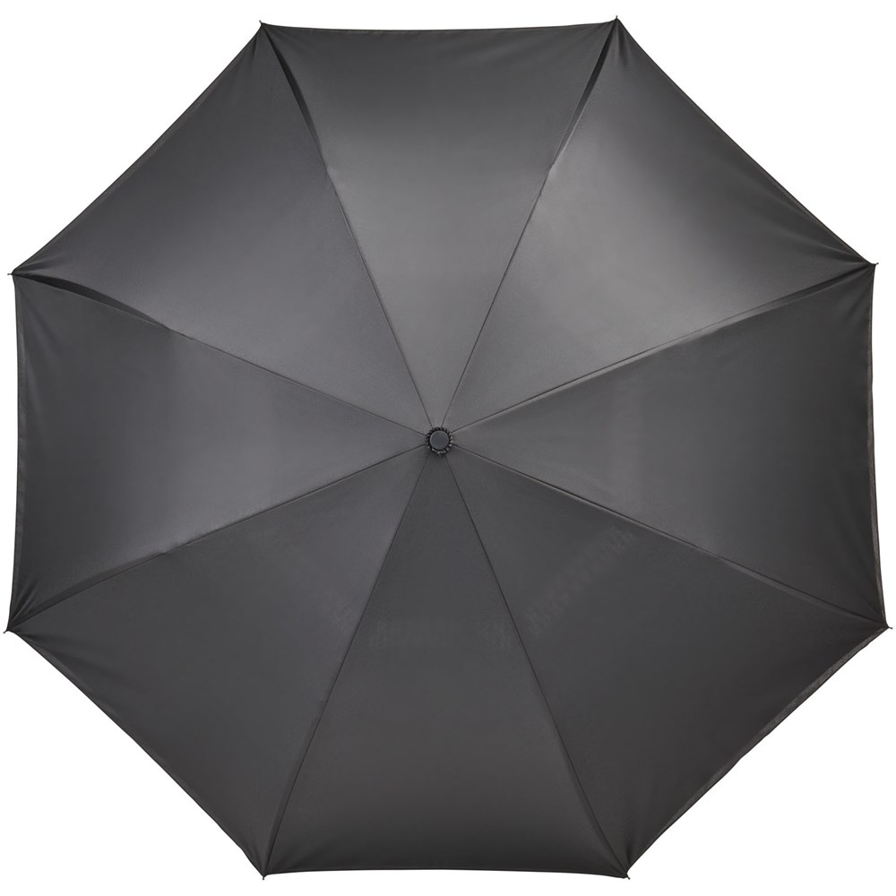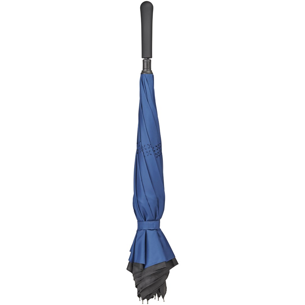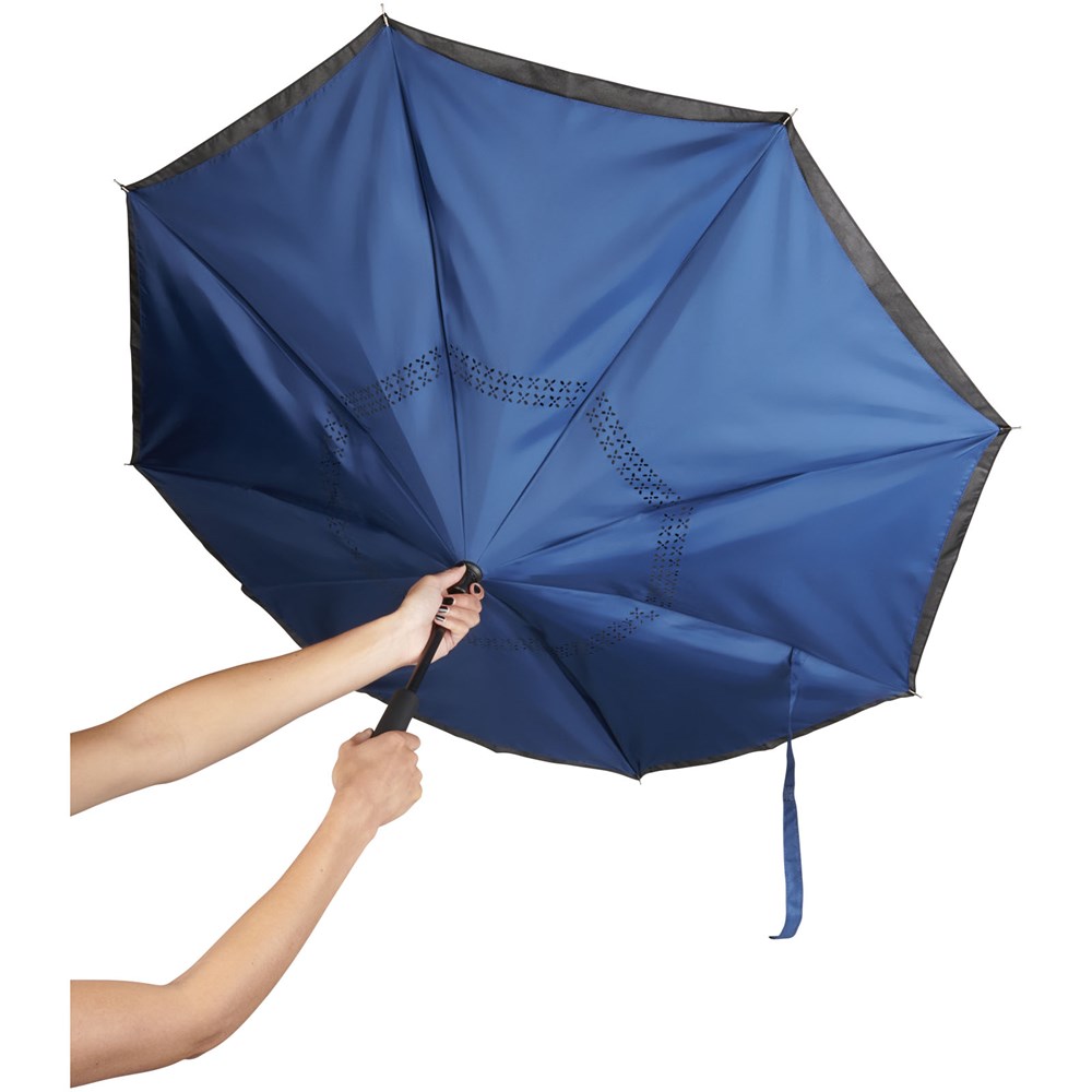 23" innovatief ontworpen omgekeerd opvouwbare paraplu. Opent en sluit 'binnenstebuiten', waardoor hij eenvoudiger te gebruiken is bij het in en uit een auto stappen doordat het water wordt vastgehouden en de buitenste oppervlakken droog blijven. De paraplu kan zelfstandig staan wanneer hij gesloten is, waardoor het water wegloopt en de paraplu opdroogt. Winddicht frame met baleinen van glasvezel. Handmatig openen met knijpvaste stang met drukknop, en een dubbellaagse polyester kap.