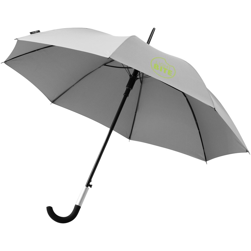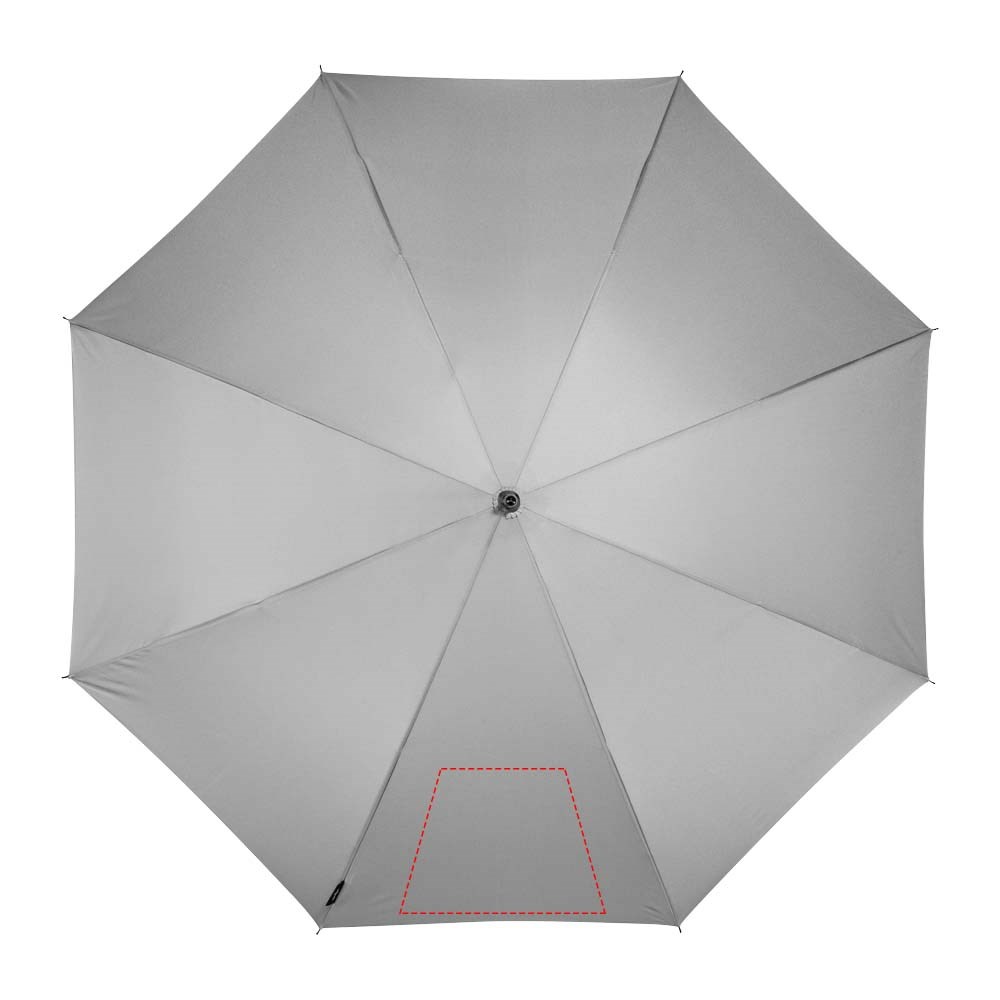 Exclusief ontworpen automatische openende paraplu. Metalen schacht en baleinen. Speciaal ontworpen rubber bekleed handvat met aluminium detail waarmee de paraplu aan de rand van een tafel kan worden gehangen. Geleverd met hoes in de kleur van de paraplu.