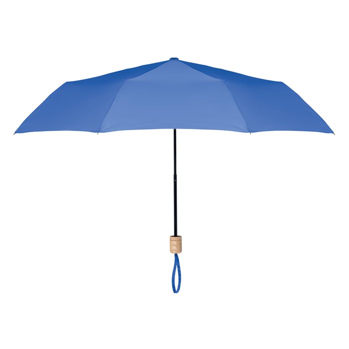 21 Inch paraplu van 190T RPET pongee met zwart metalen frame en baleinen. Houten handvat. In 3 delen opvouwbaar. Inclusief bijpassend hoesje. Opent en sluit handmatig.