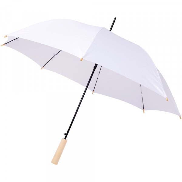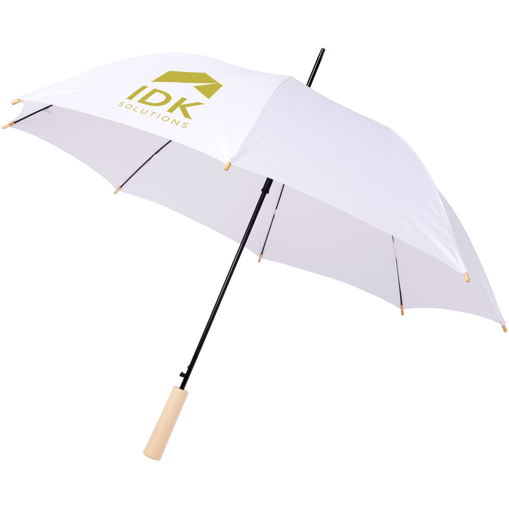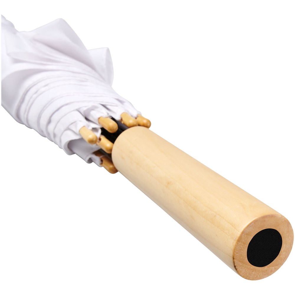 Automatisch openende paraplu met een gerecycled PET pongé polyester scherm. De stevige metalen schacht en het hoogwaardige frame met glasvezel ribben bieden flexibiliteit bij winderige omstandigheden. In combinatie met het houten handvat, de punten en het gerecyclede PET pongé polyester scherm biedt het model een duurzame keuze. Verkrijgbaar in de meest diverse moderne kleuren met een groot decoratievlak op elk van de panelen en ook de houten handgreep kan worden gedecoreerd.