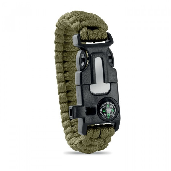 Paracord survival armband met o.a. een kompas (decoratief), fluitje, magnesiumstick en een mesje. De armband zelf kan ontrafeld worden tot een lang touw. Ideaal voor kamperen, vissen en outdoor uitstapjes. Inclusief metalen plaatje voor je logo.
