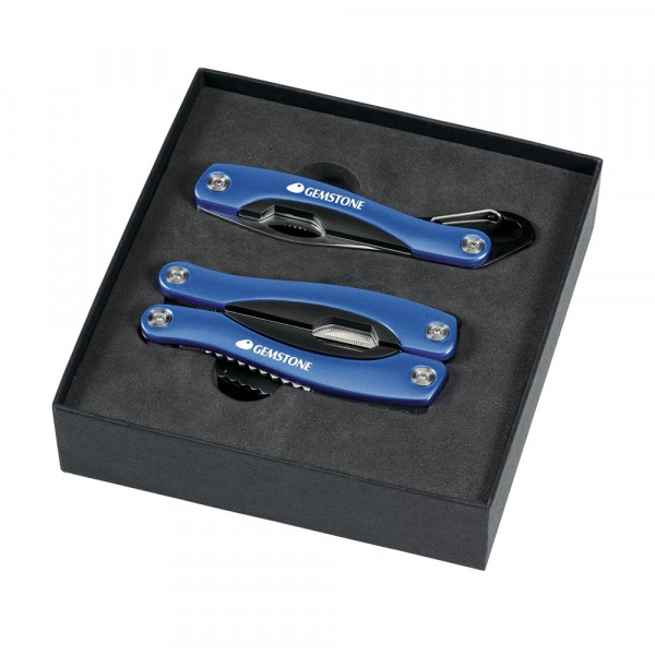 Geschenkset: 9-delige RVS multitang met 13 functies (tang, draadknipper, 3 schroevendraaiers, priem, vijl, blikopener, flesopener, visschraper, visonthaker, mes, philips kruiskopschroevendraaier) en RVS zakmes met karabijnhaak en vergrendeling. Beide met aluminium handgreep in metallic look. Incl. nylon etui. Per set in doos. Op het bezit en/of dragen van messen of multitools in het openbaar kunnen lokale regels van toepassing zijn.