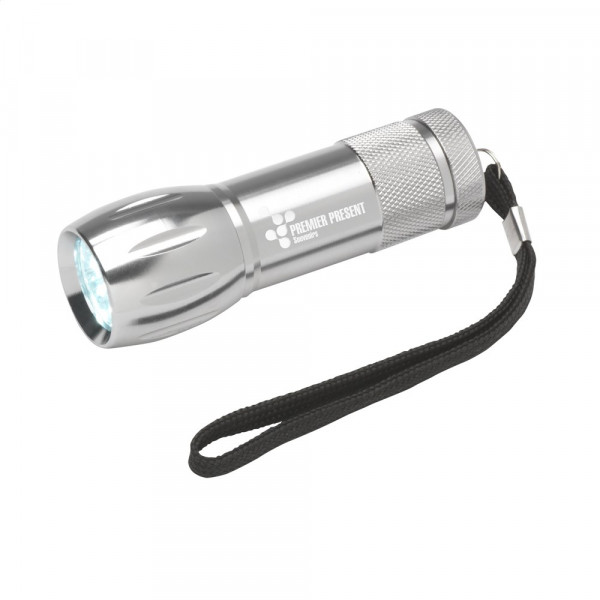 Aluminium zaklamp met 9 LED-lampjes en afneembare polsriem. Afm. Ø 2,7 x 9,7 cm. Incl. batterijen. Per stuk in geschenkblik.