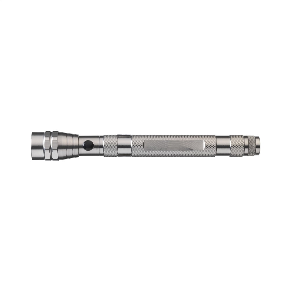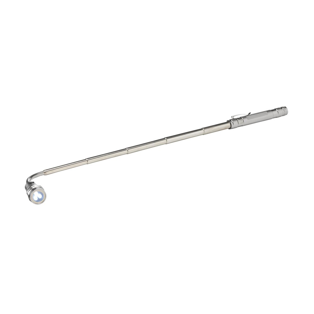 RVS zaklamp met 3 felwitte, energiezuinige LED-lampjes. Voorzien van een telescoopfunctie, uitschuifbaar tot 56,5 cm, flexibele, magnetische kop en bevestigingsclip. Incl. batterijen. Per stuk in doos.