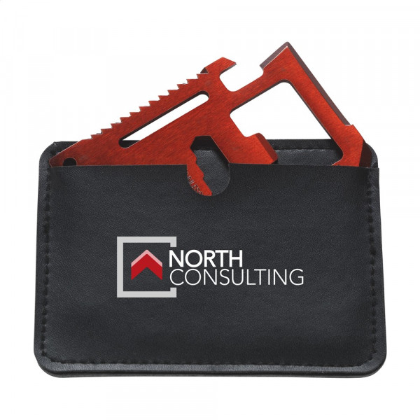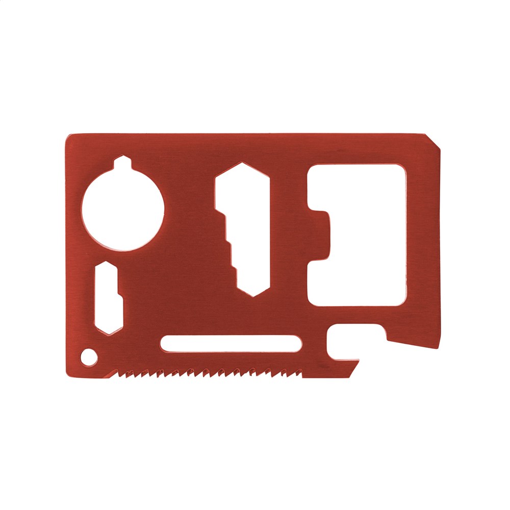 RVS multitool in creditcardformaat met 11 functies: blikopener, mes, schroevendraaier, liniaal, flesopener, moersleutel, vleugelmoersleutel , zaag, koersgraad aanwijzer, 2-positie sleutel en sleutelringgat. In imitatieleren etui. Inclusief gebruiksaanwijzing.