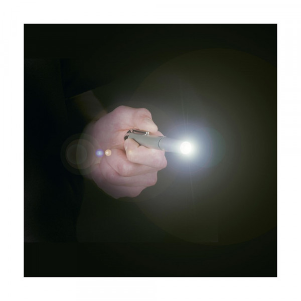 Kunststof staaflampje met wit LED-lampje, metalen clip en tussenring. Zodra de clip en houder contact maken, gaat het lampje aan. Incl. celbatterijen. Per stuk in doosje.