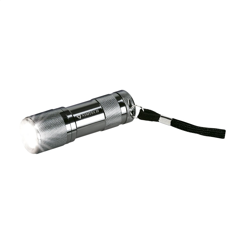 Aluminium staaflamp met felwit licht van 9 LED-lampjes. Afm. Ø 2 x 9,5 cm. Incl. batterijen, afneembare polslus en nylon etui. Per stuk in doos.