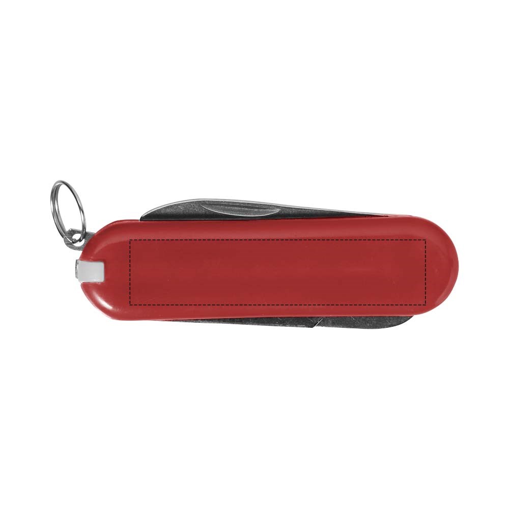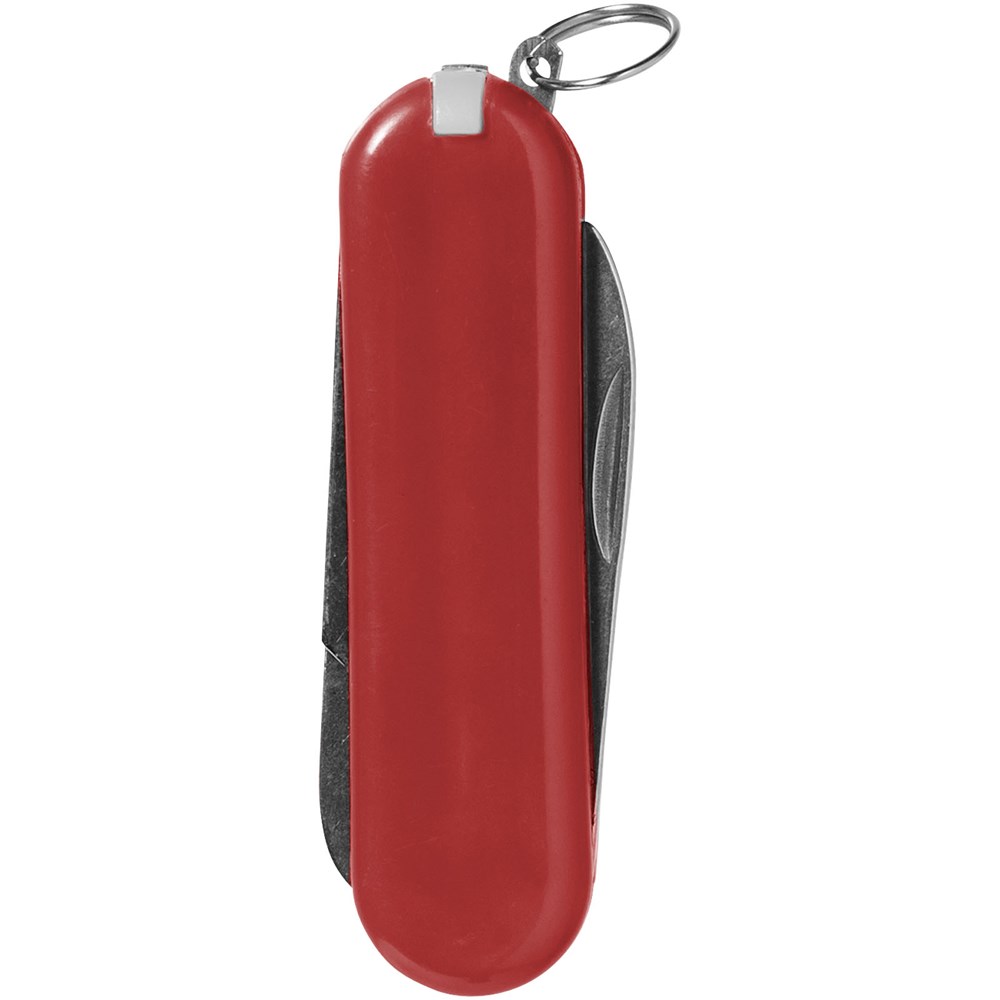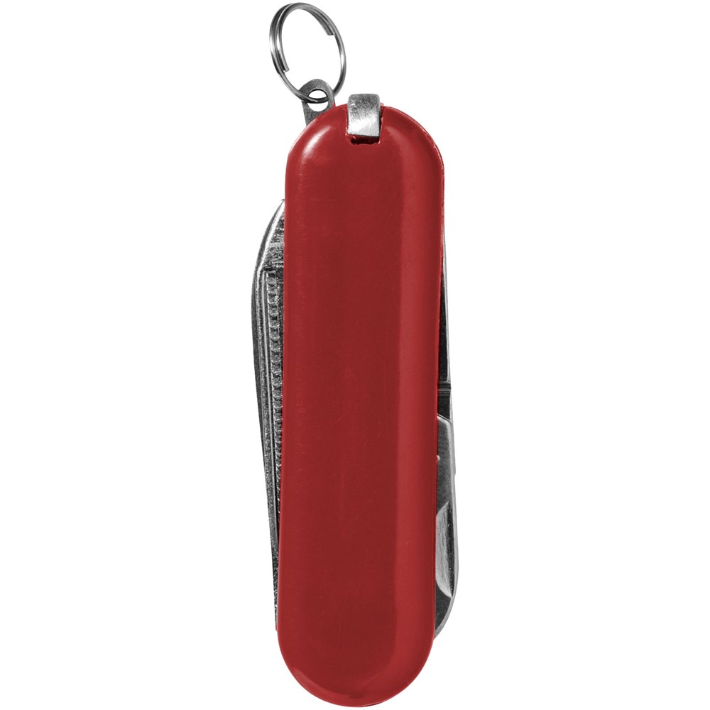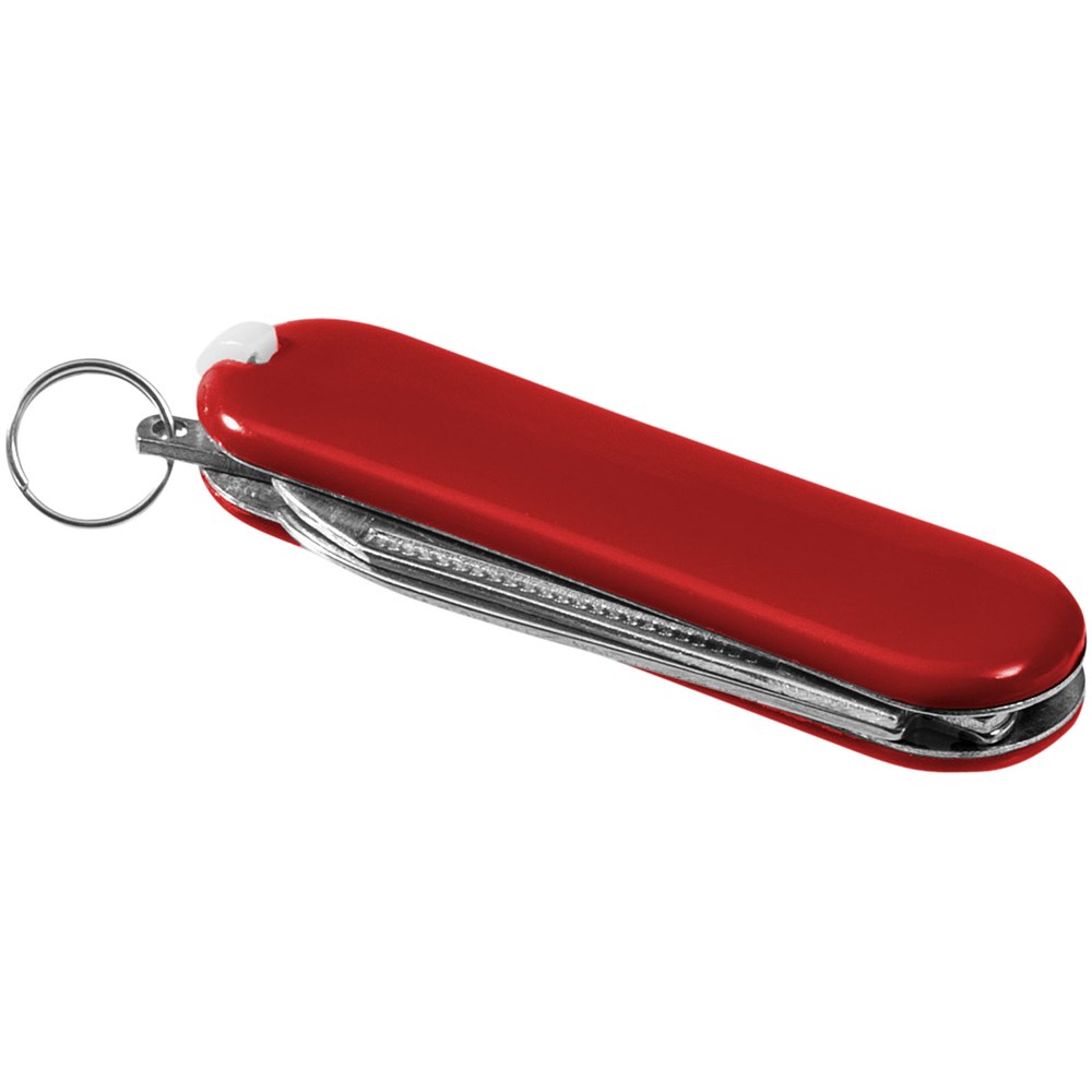 Zakmes met mes, schaar met veermechanisme, pincet, tandenstoker, nagelvijl en mini-sleutelring.