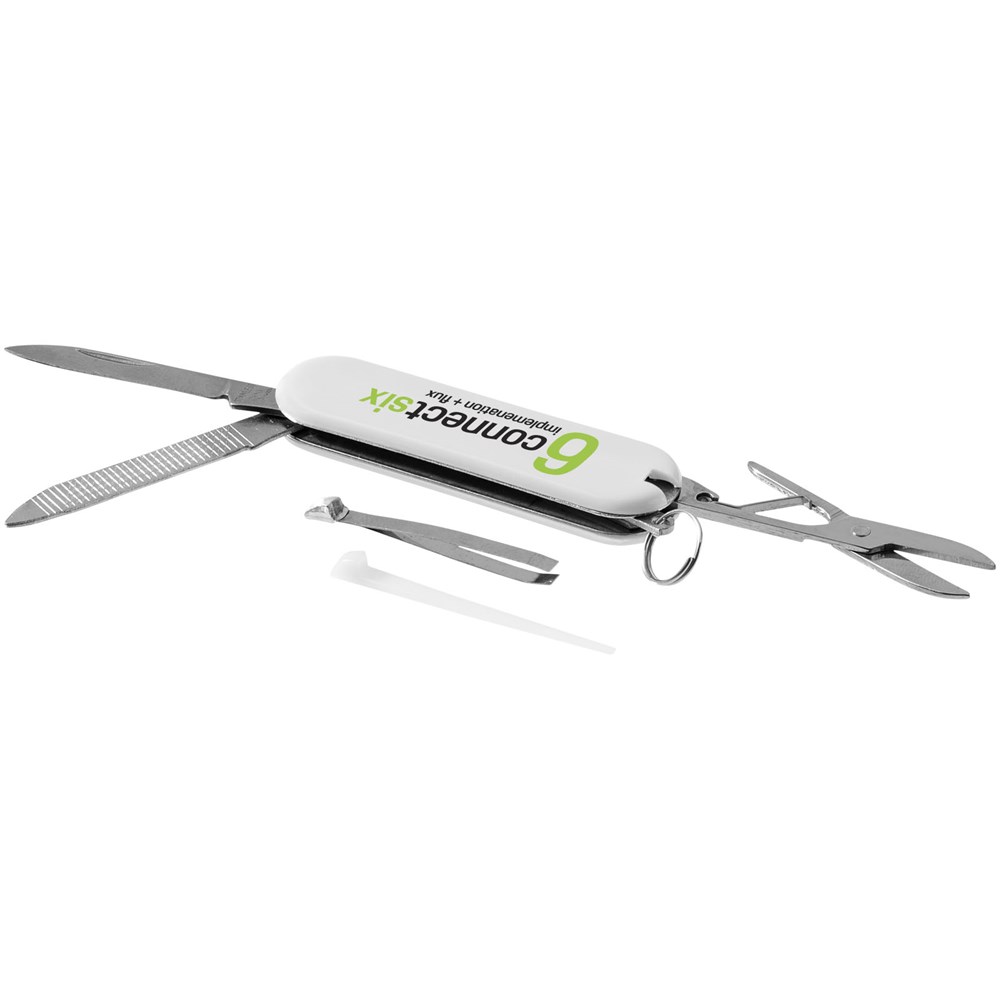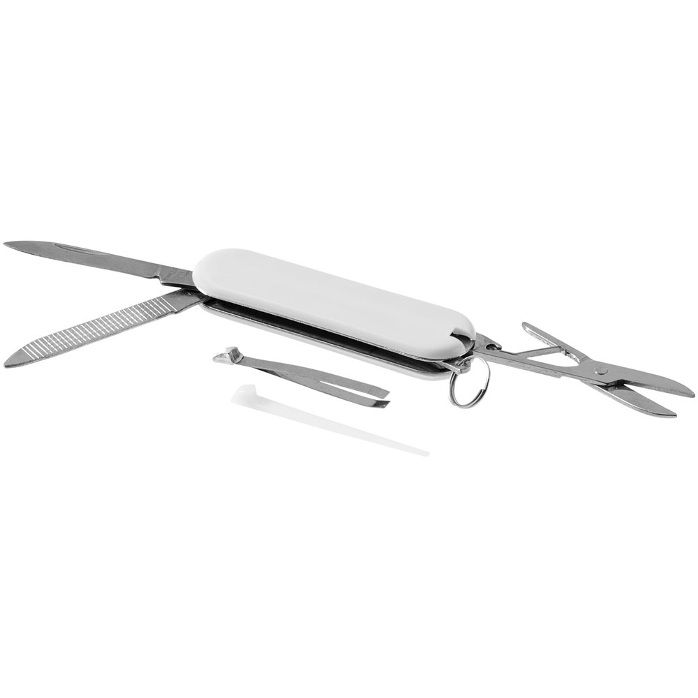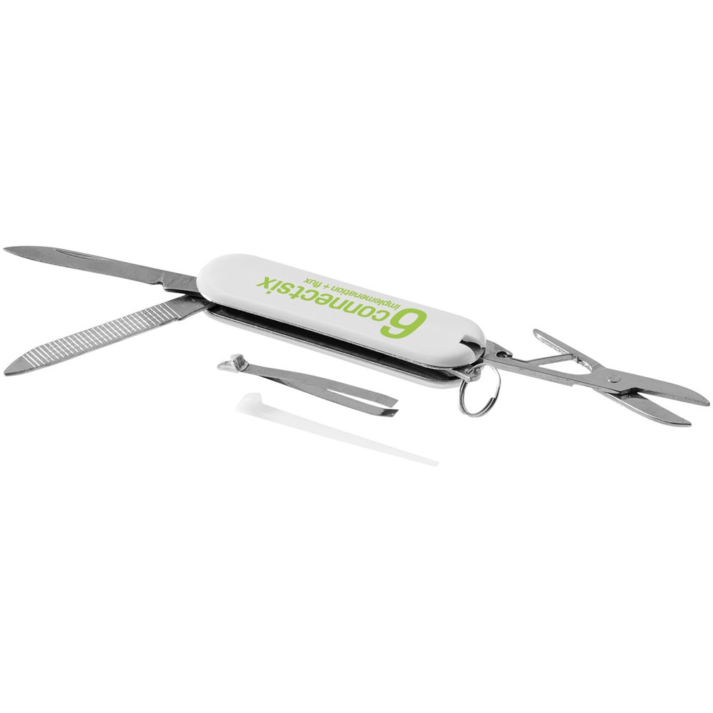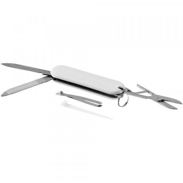 Zakmes met mes, schaar met veermechanisme, pincet, tandenstoker, nagelvijl en mini-sleutelring.