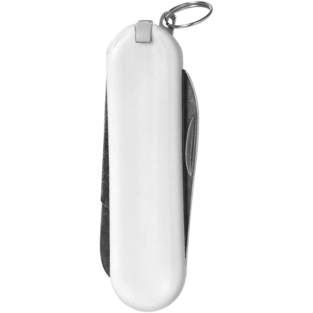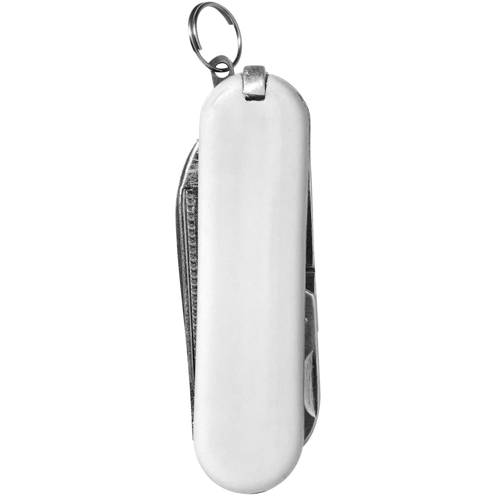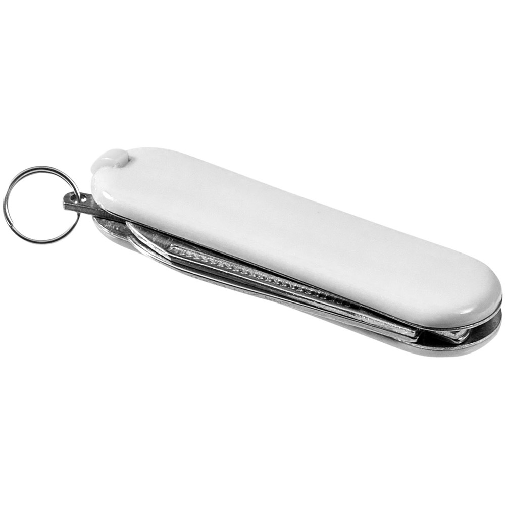 Zakmes met mes, schaar met veermechanisme, pincet, tandenstoker, nagelvijl en mini-sleutelring.