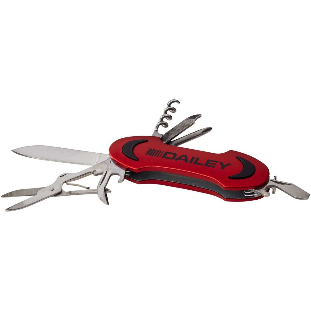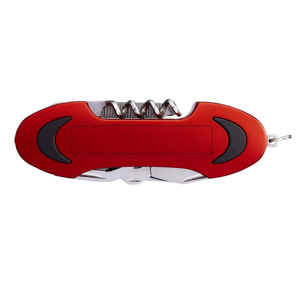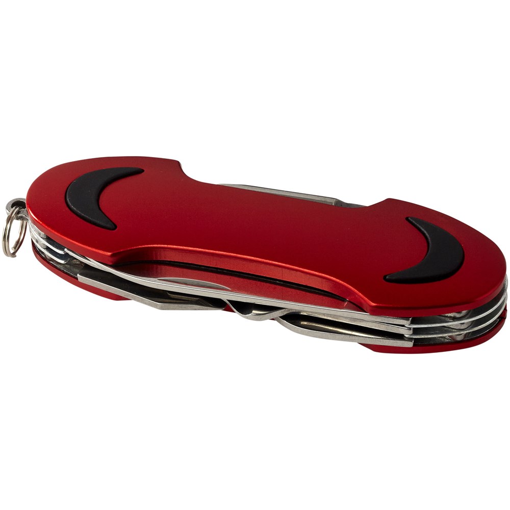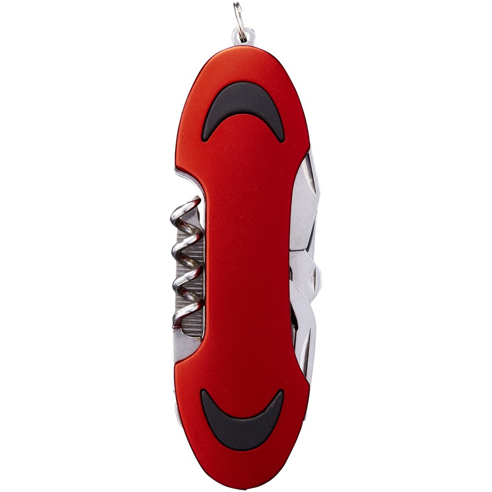 Zakmes met mes, schaar, kurkentrekker, flesopener, Philips schroevendraaier, nagelvijl, kast lifter met kratopener en platte schroevendraaier. Inclusief mini-metalen split sleutelring.