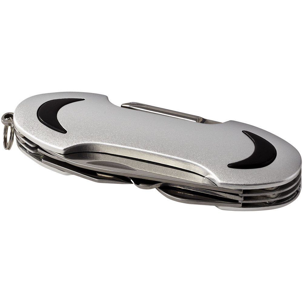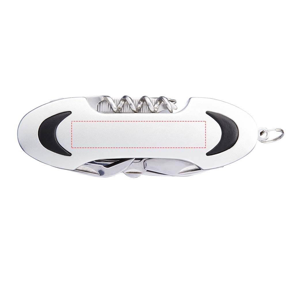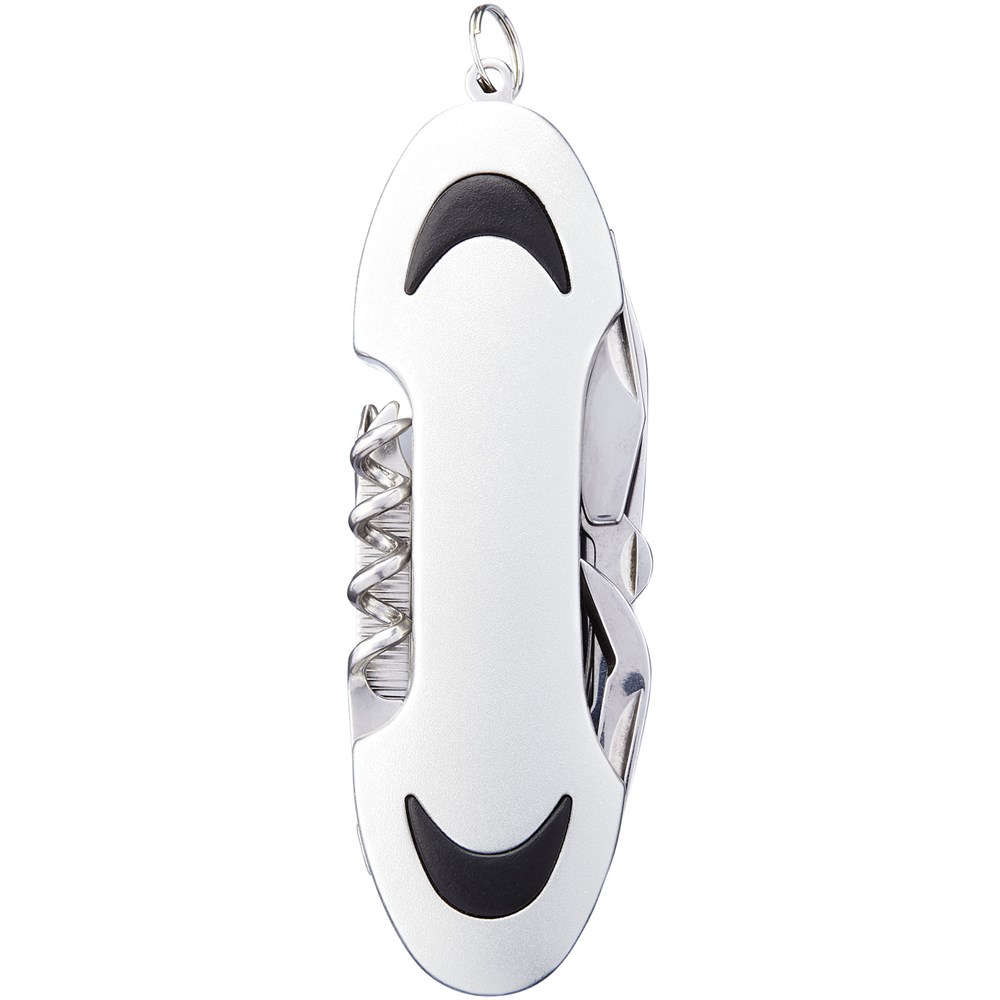 Zakmes met mes, schaar, kurkentrekker, flesopener, Philips schroevendraaier, nagelvijl, kast lifter met kratopener en platte schroevendraaier. Inclusief mini-metalen split sleutelring.