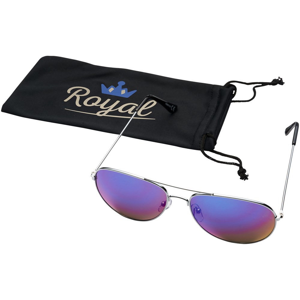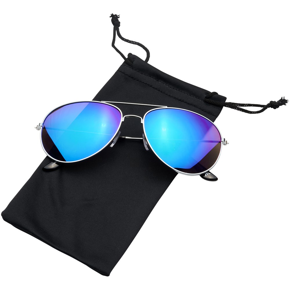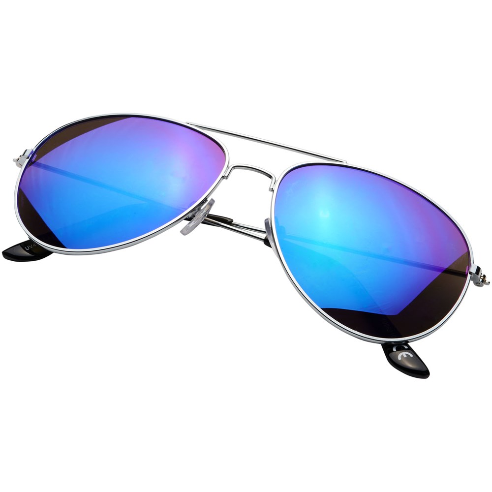 Klassiek vormgegeven zonnebril met trendy gekleurde spiegelglazen. Wordt geleverd met zakje van microvezel dat gebruikt kan worden als reinigingsdoekje. Voldoet aan EN ISO 12312-1 en UV-400, glazen zijn van klasse 3.