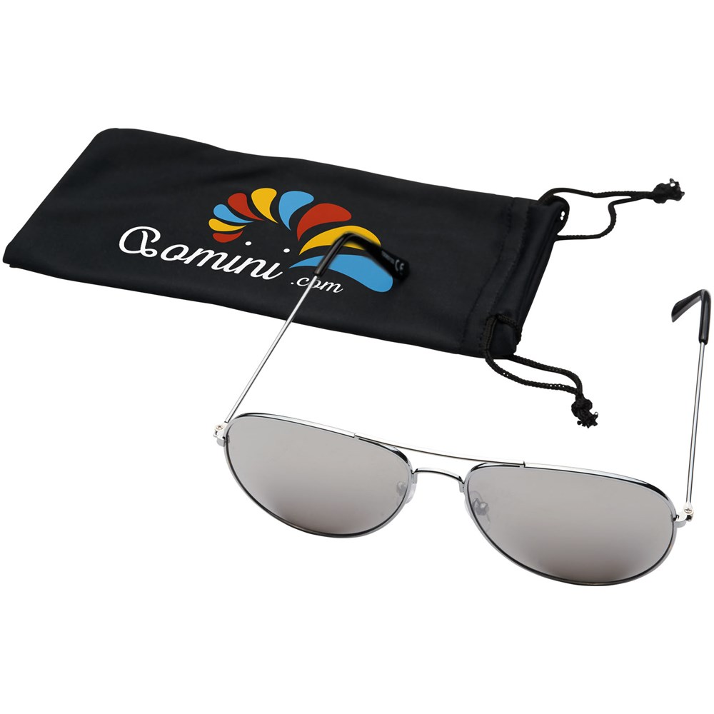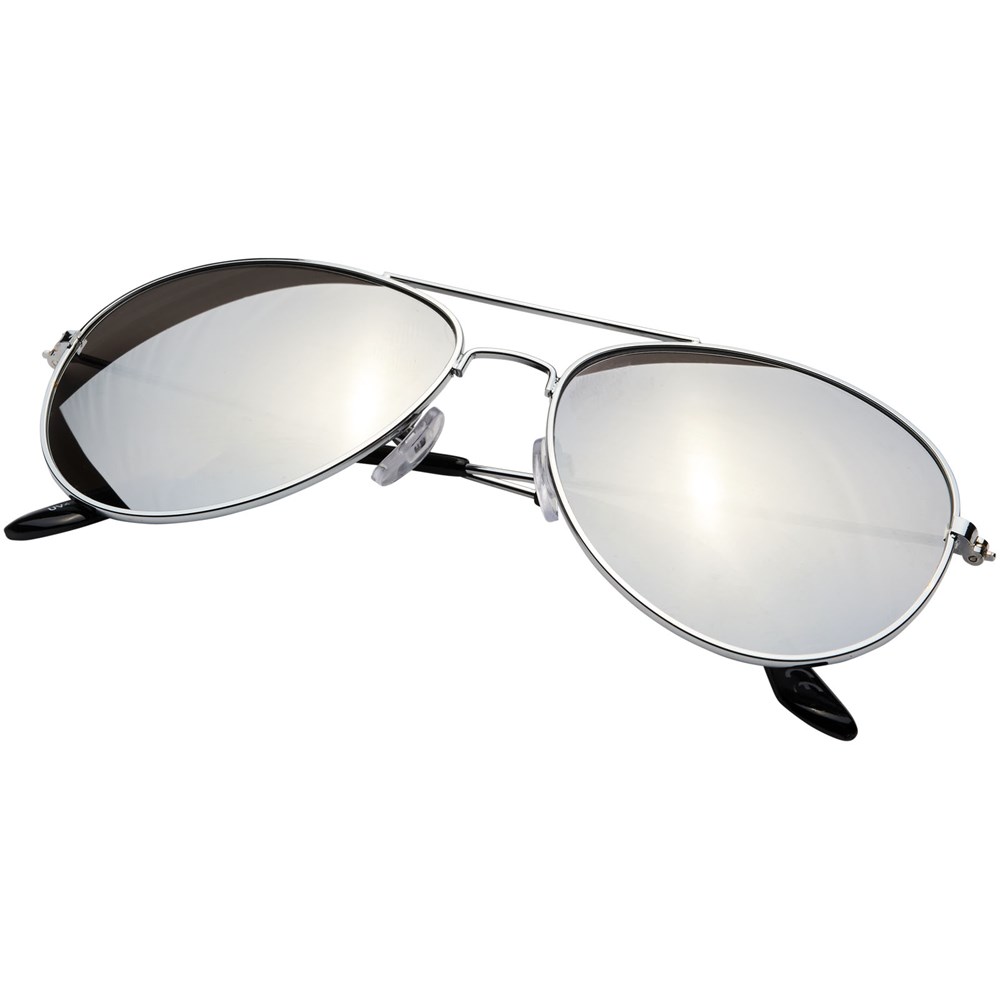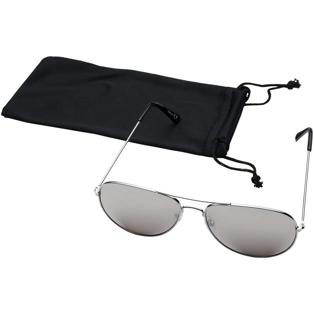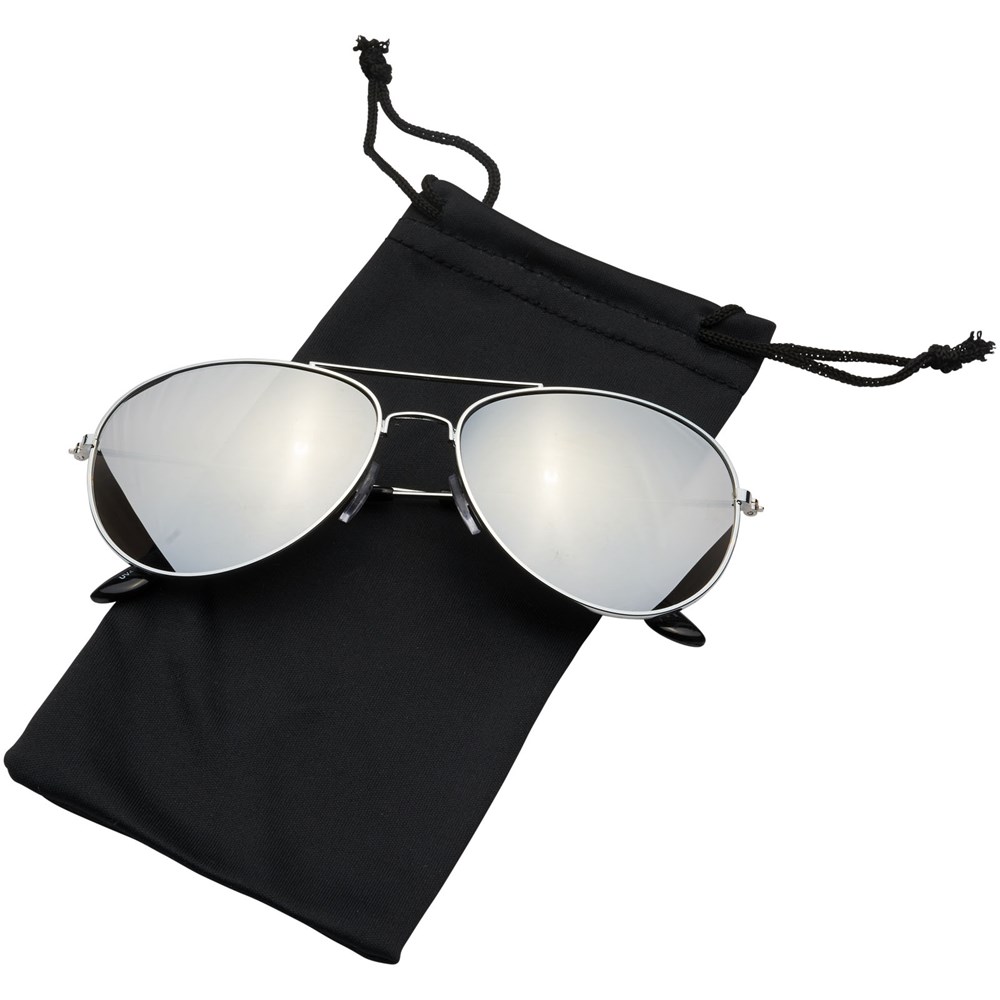 Klassiek vormgegeven zonnebril met trendy gekleurde spiegelglazen. Wordt geleverd met zakje van microvezel dat gebruikt kan worden als reinigingsdoekje. Voldoet aan EN ISO 12312-1 en UV-400, glazen zijn van klasse 3.