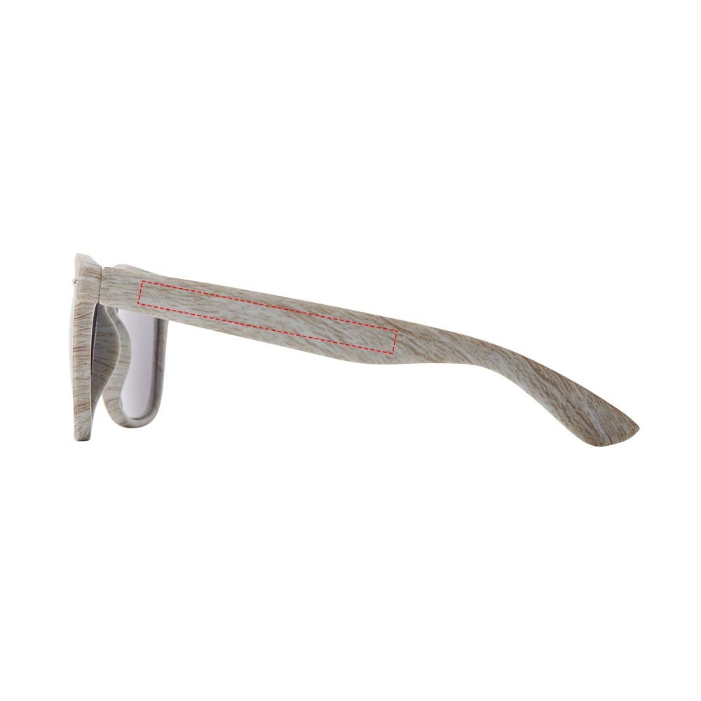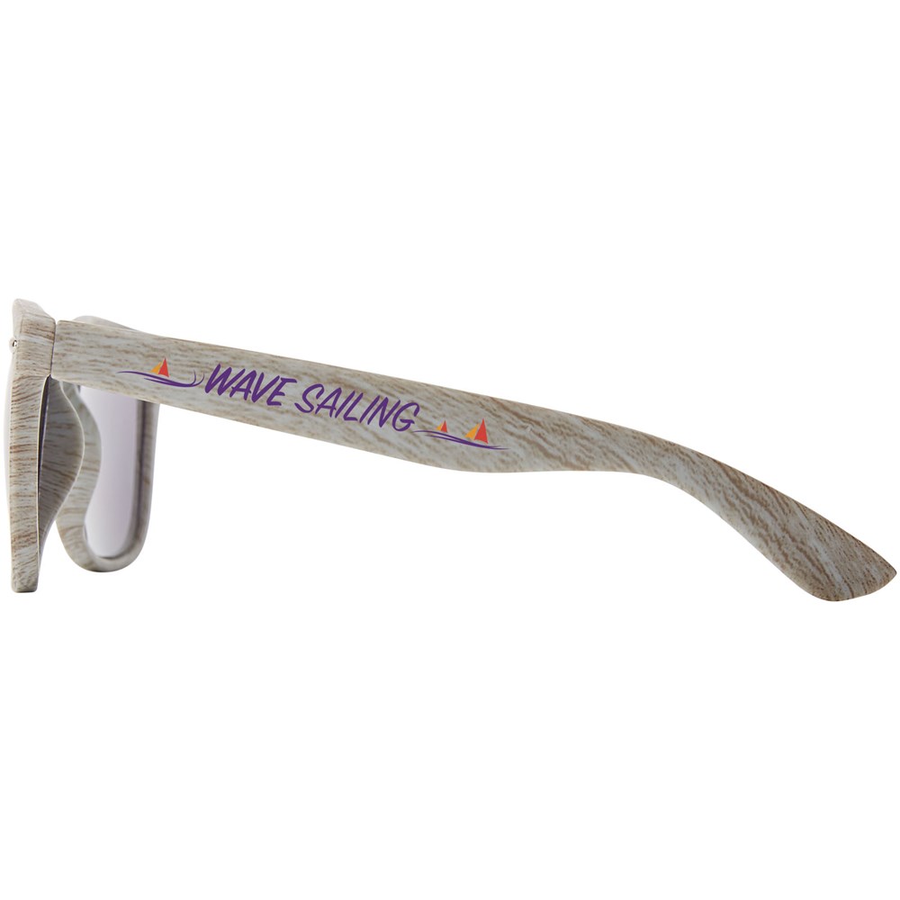 Retro design zonnebril in houtlook afwerking met categorie 3 lenzen. Voldoet aan EN ISO 12312-1 en UV 400.