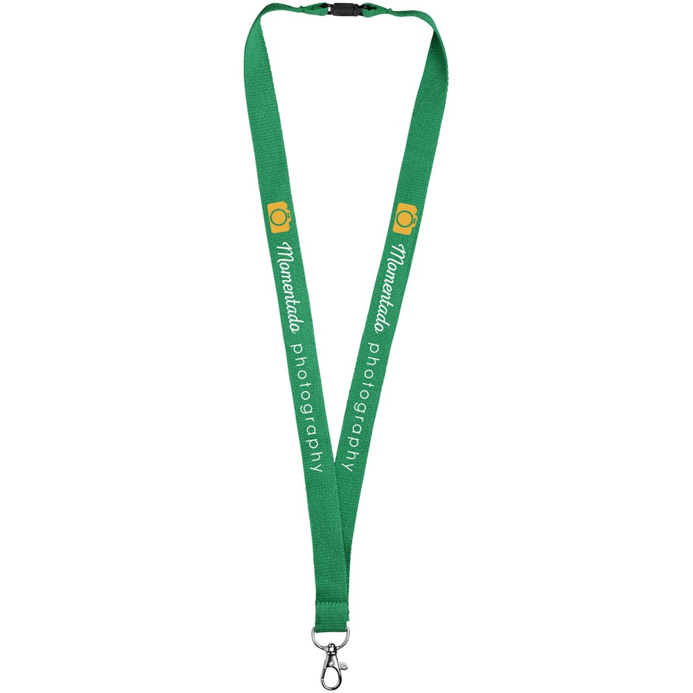 100% katoenen lanyard met veiligheidssluiting. Geweldige prijs/kwaliteitverhouding en indrukwekkende logoformaten bij het zoeken naar een groene keuze. Hoogwaardige ovalen haak met karabijnsluiting die ideaal is voor het vastmaken van een naambadge, ID-kaart of sleutels.