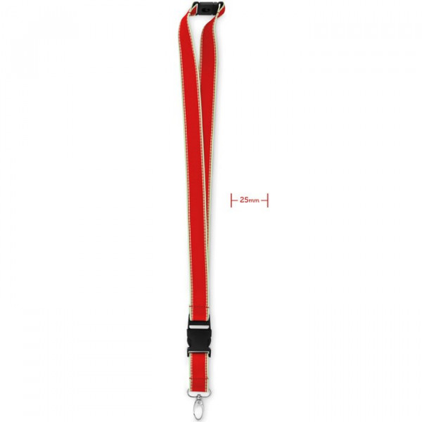 Glow in the dark lanyard met metalen mini karabijnhaak en veiligheidssluiting. Het onderste gedeelte kan losgeklikt worden d.m.v. een kunststof clip. Breed 25 mm.
