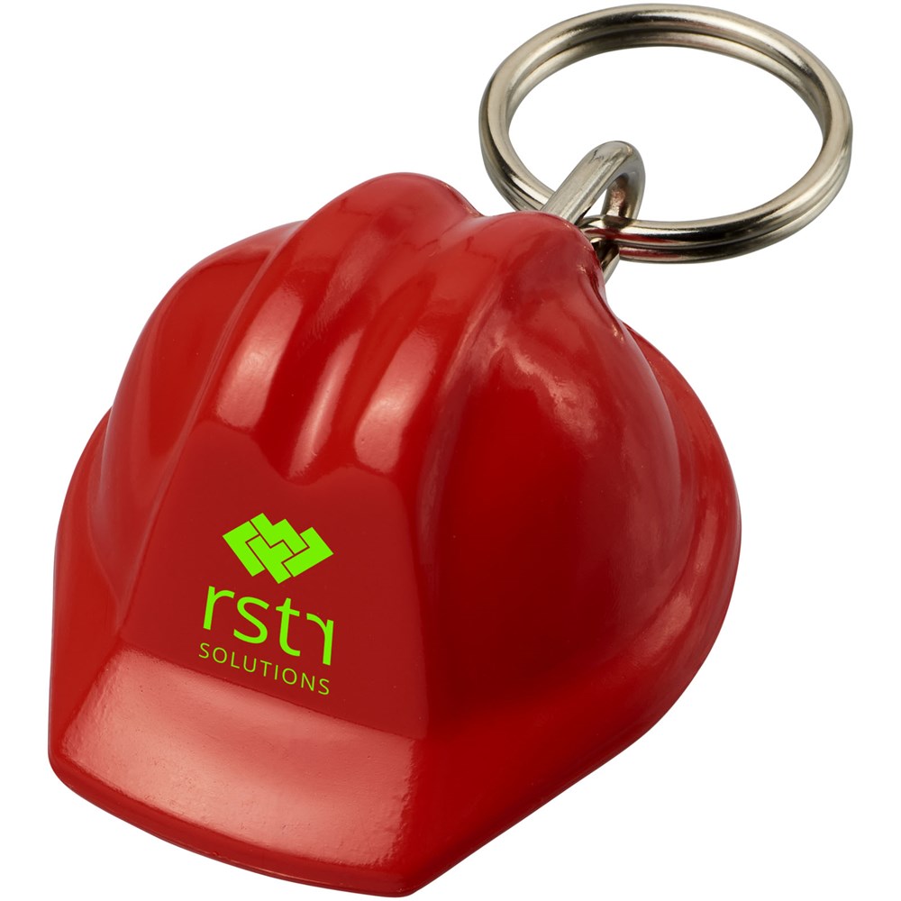 Sleutelhanger in de vorm van een helm met metalen sleutelring. Ideaal voor bouw- of veiligheidsorganisaties.
