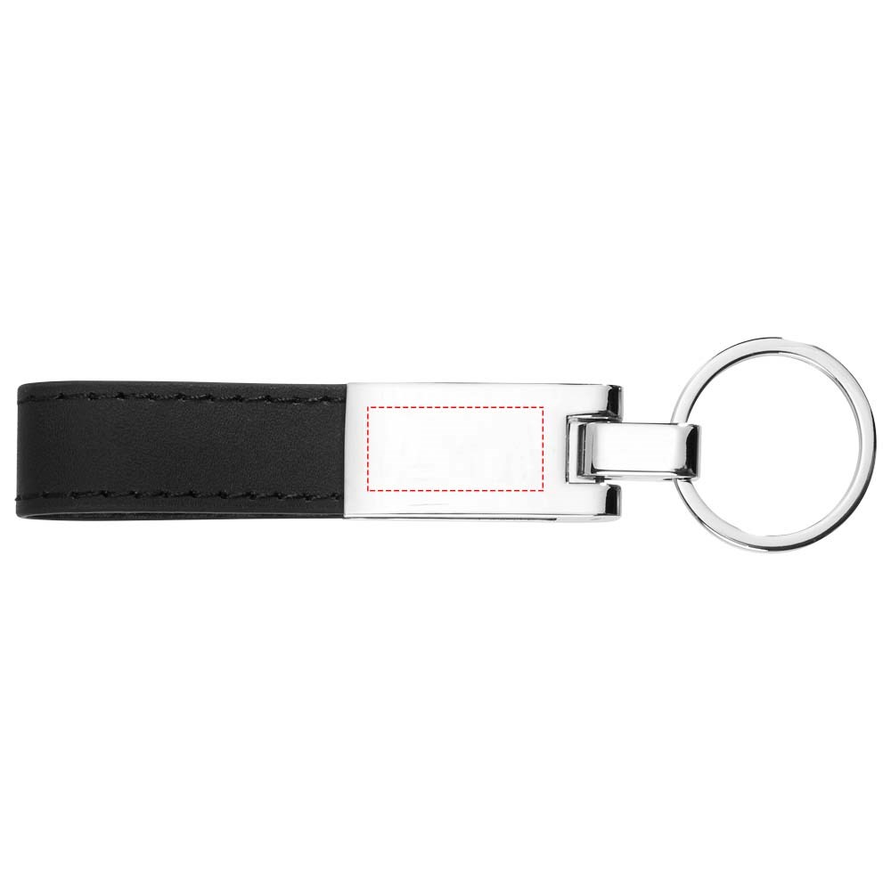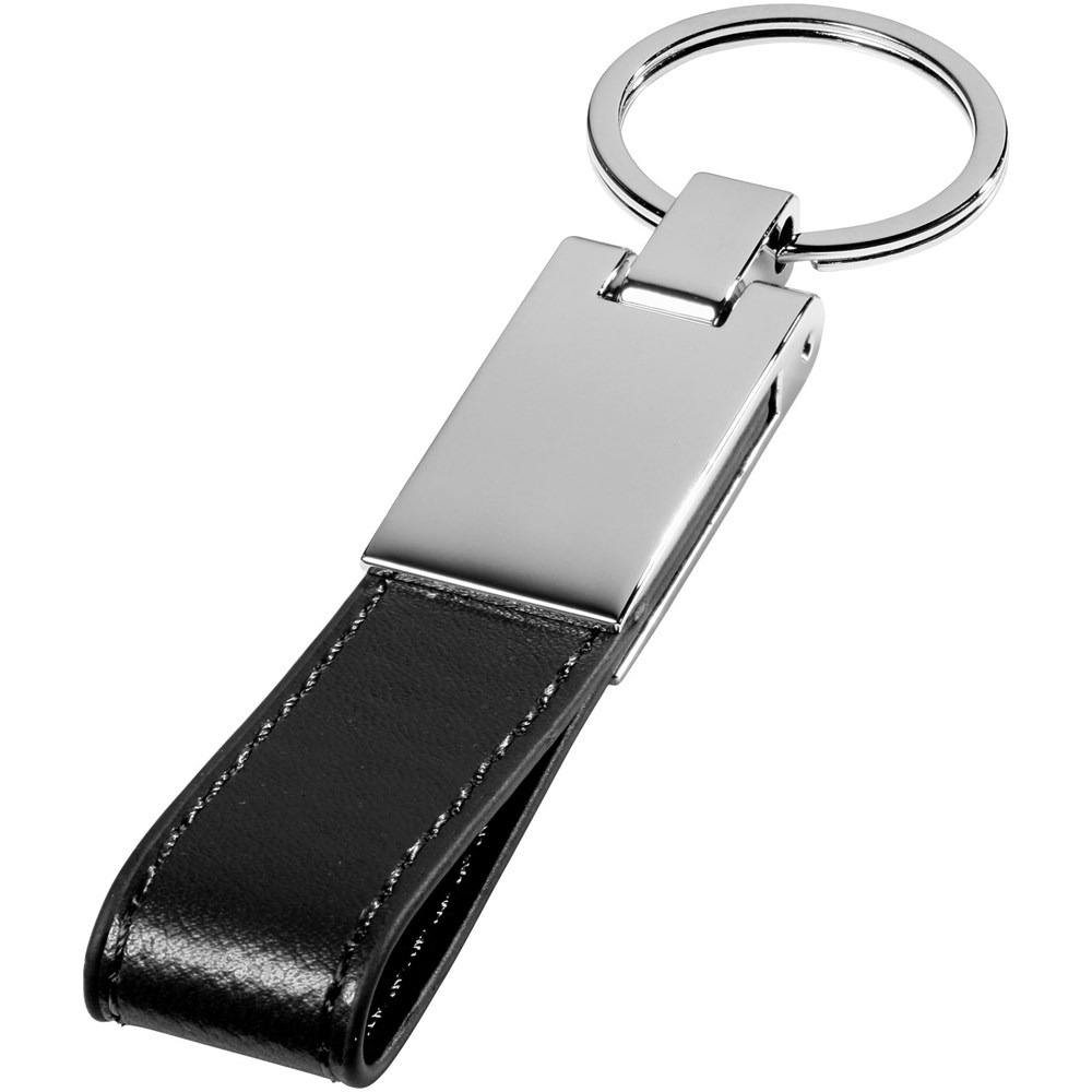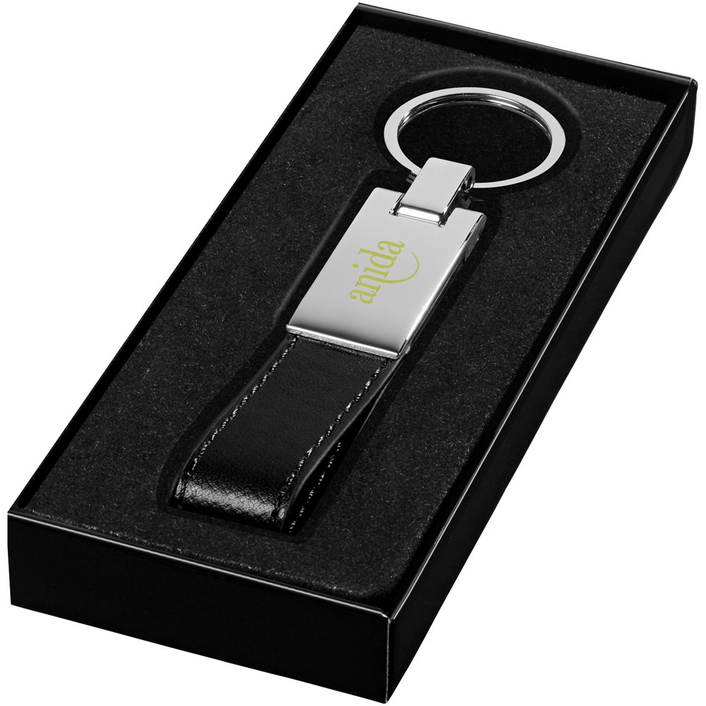 Verzilverde sleutelhanger geleverd in een zwarte geschenkverpakking.