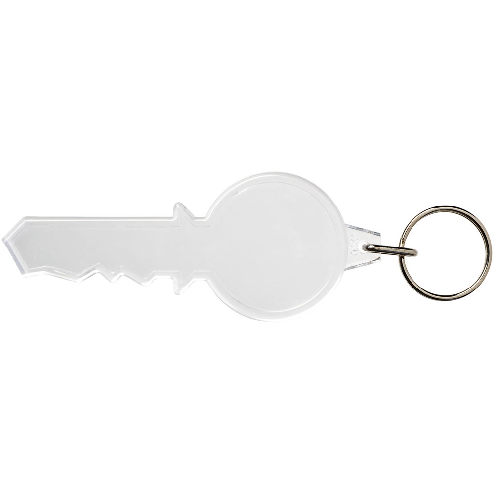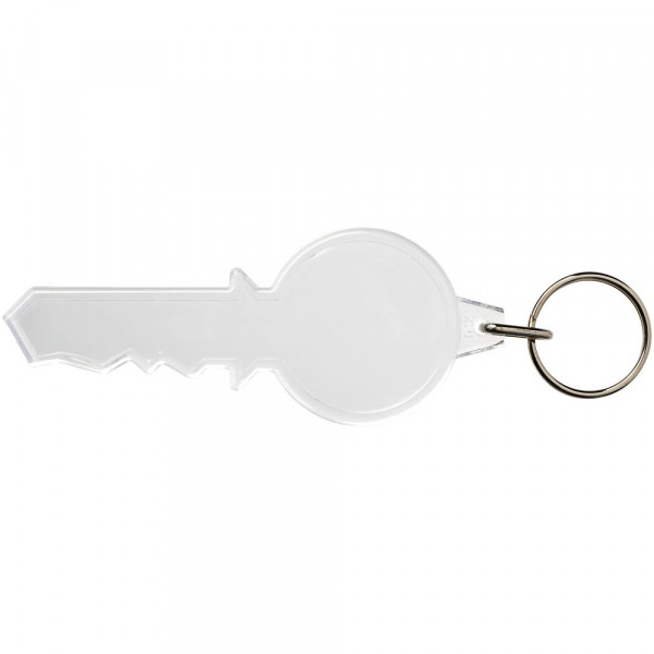 Doorzichtige sleutelvormige sleutelhanger met metalen sleutelring. De metalen lusring biedt een vlak profiel dat ideaal is voor de post. Afmetingen van het te bedrukken inzetstuk: 7,9 cm x 3,2 cm.