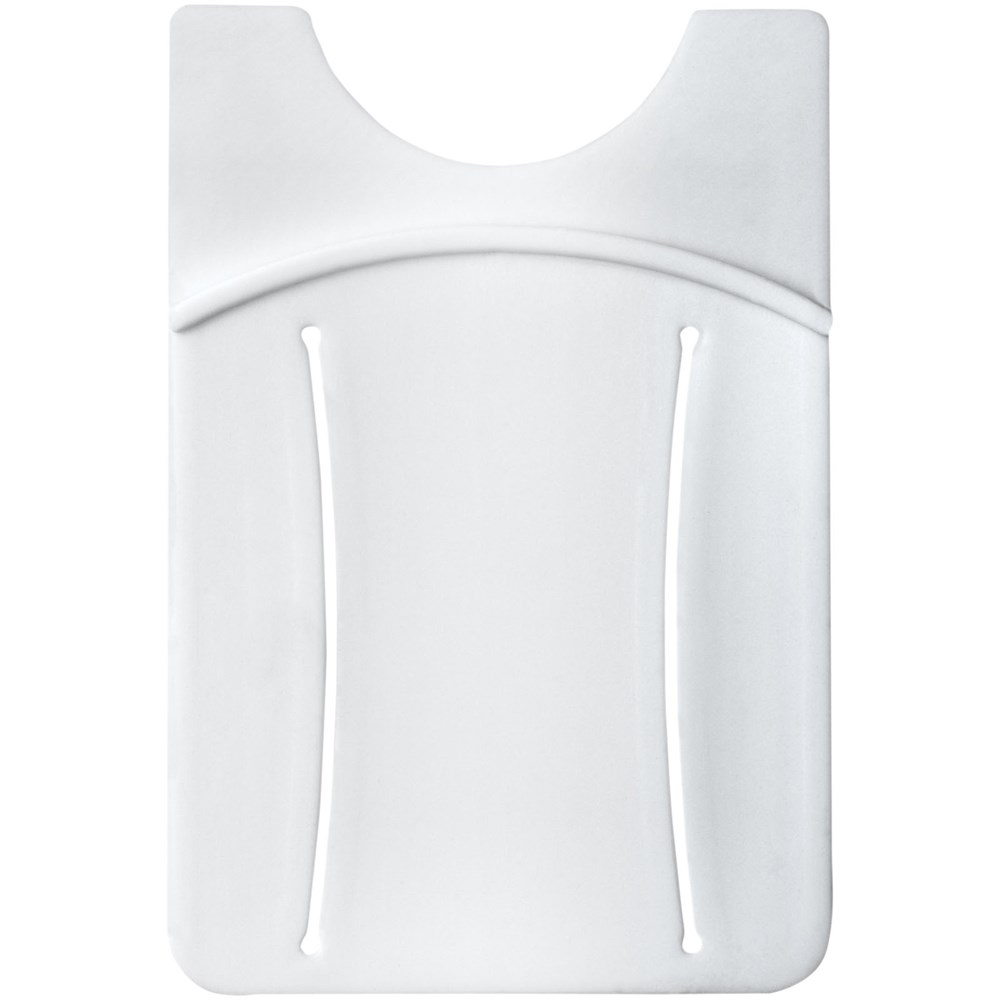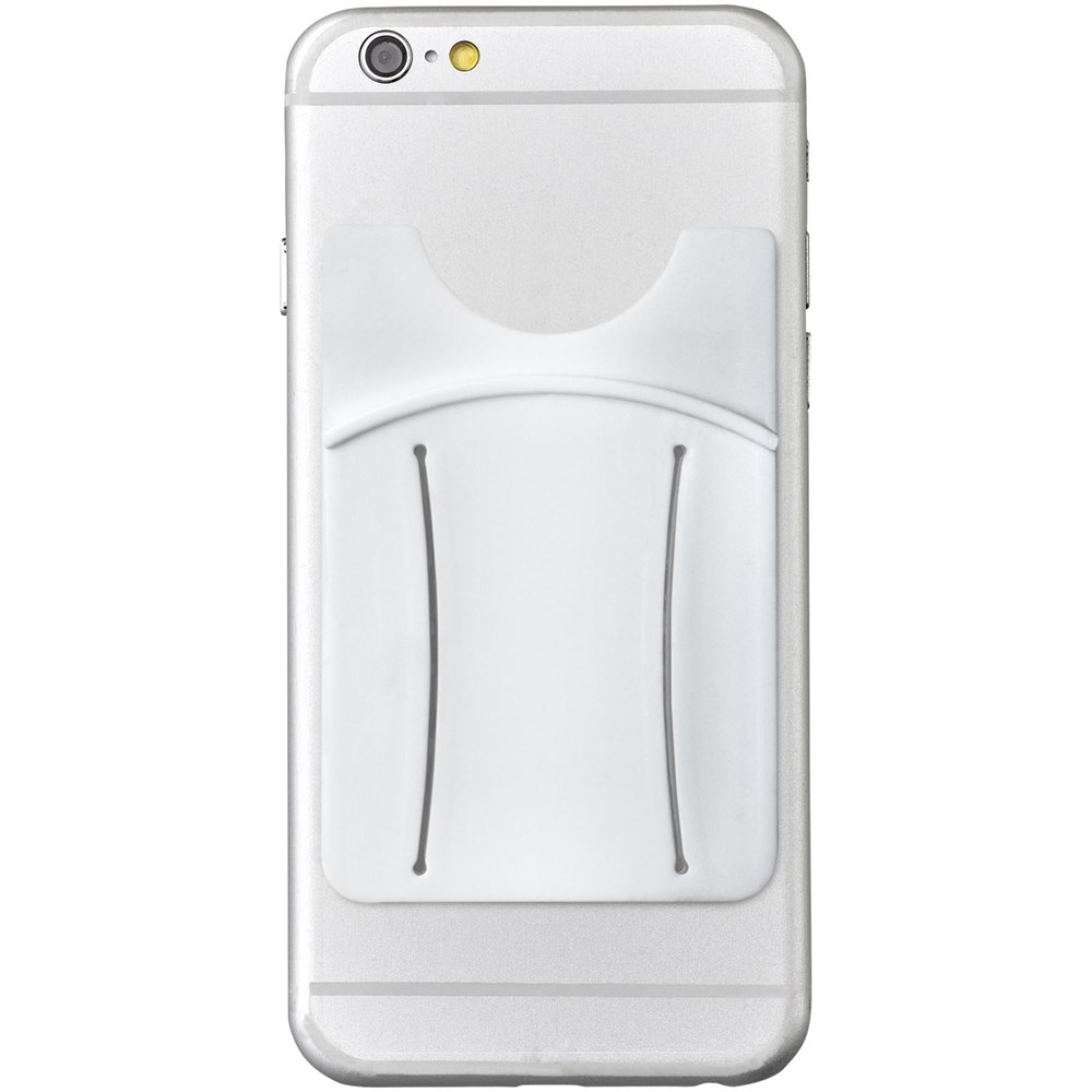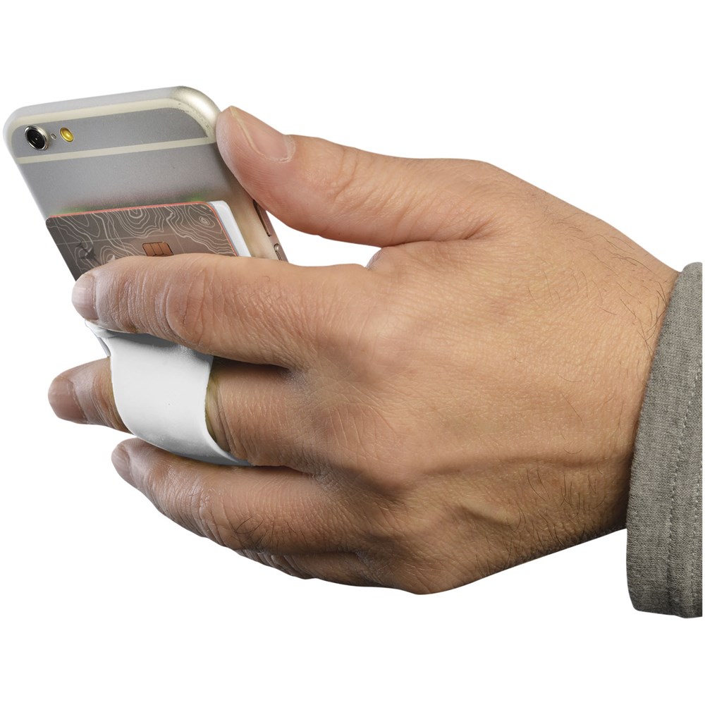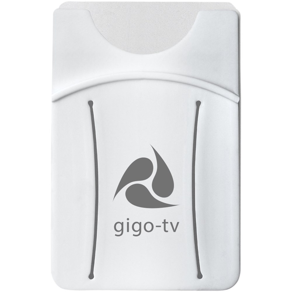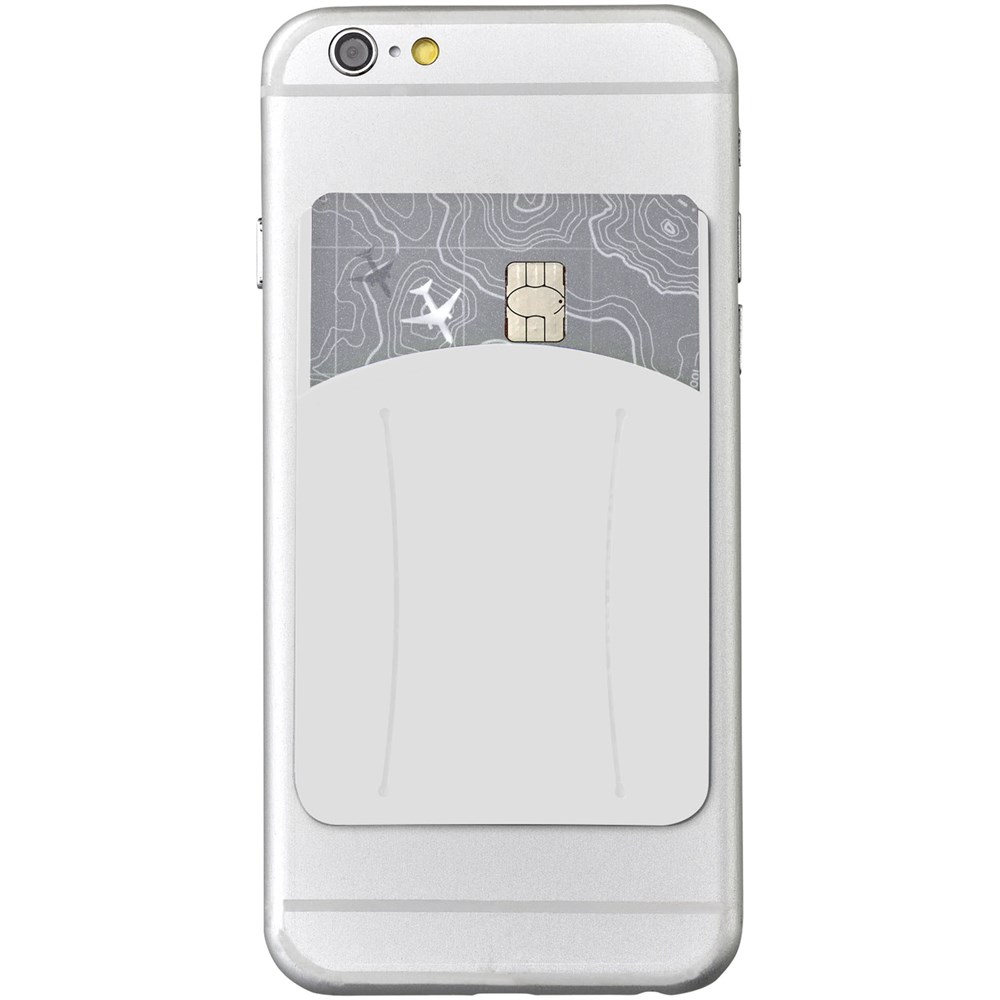 De ideale accessoire voor de smartphone. De siliconen kaarthouder wordt aangebracht aan de achterzijde van de telefoon door middel van een kleefstrook. Geschikt voor 1 creditcard, identiteitskaart, hotelkamerkaart of contant geld. Perfect voor als je geen tas mee wilt nemen of waardevolle spullen veilig bij elkaar wilt houden. Inclusief vingerslot om de telefoon makkelijk te kunnen bedienen. Drukleur mogelijk in zwart of wit.