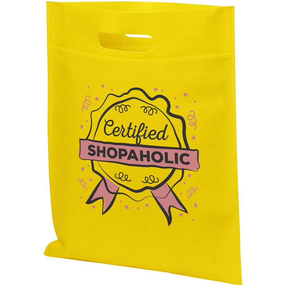 Open hoofdvak met uitgestanst handvat. Dichtgelaste naden. Herbruikbaar en een geweldig alternatief voor plastic tassen op beurzen en promotie-evenementen.
