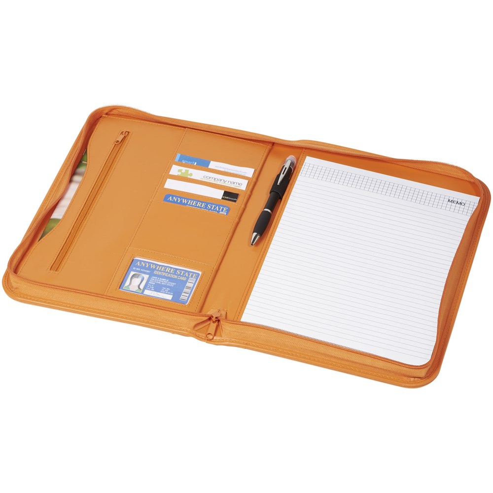 Portfolio A4 formaat met ritssluiting, ritsvak, pennenlus, documentvakken en notitieblok met 20 pagina's gelinieerd papier. Pen en accessoires niet inbegrepen.
