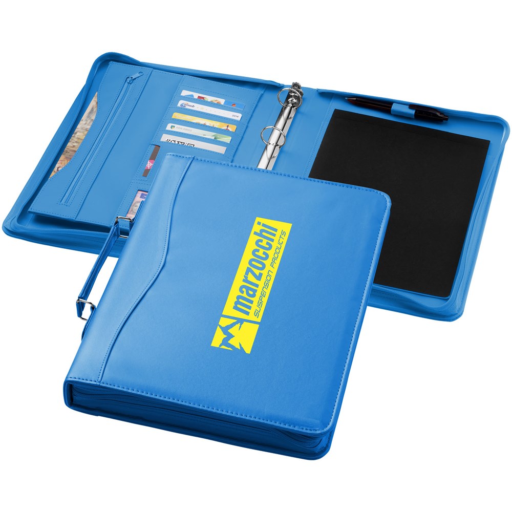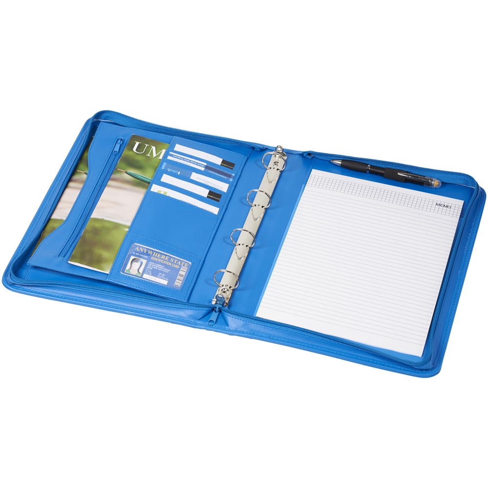 Portfolio A4 formaat met handgreep, ritssluiting, ringband, ritsvak en documentvakken. Met notitieblok met 20 pagina's gelinieerd papier. Pen en accessoires niet inbegrepen.